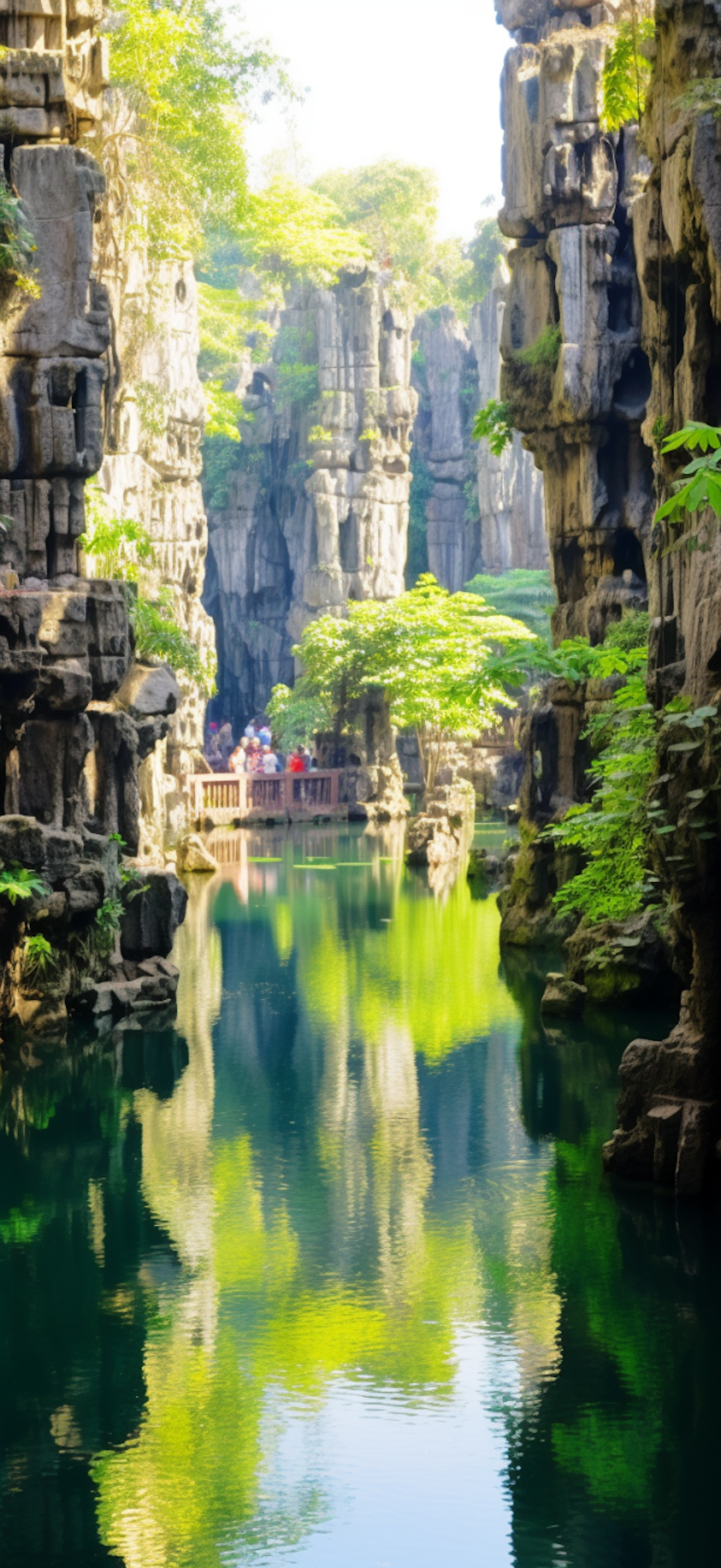 Serene canyon with towering rocks, lush greenery, and a reflective waterway. A wooden bridge with people adds scale and interest.