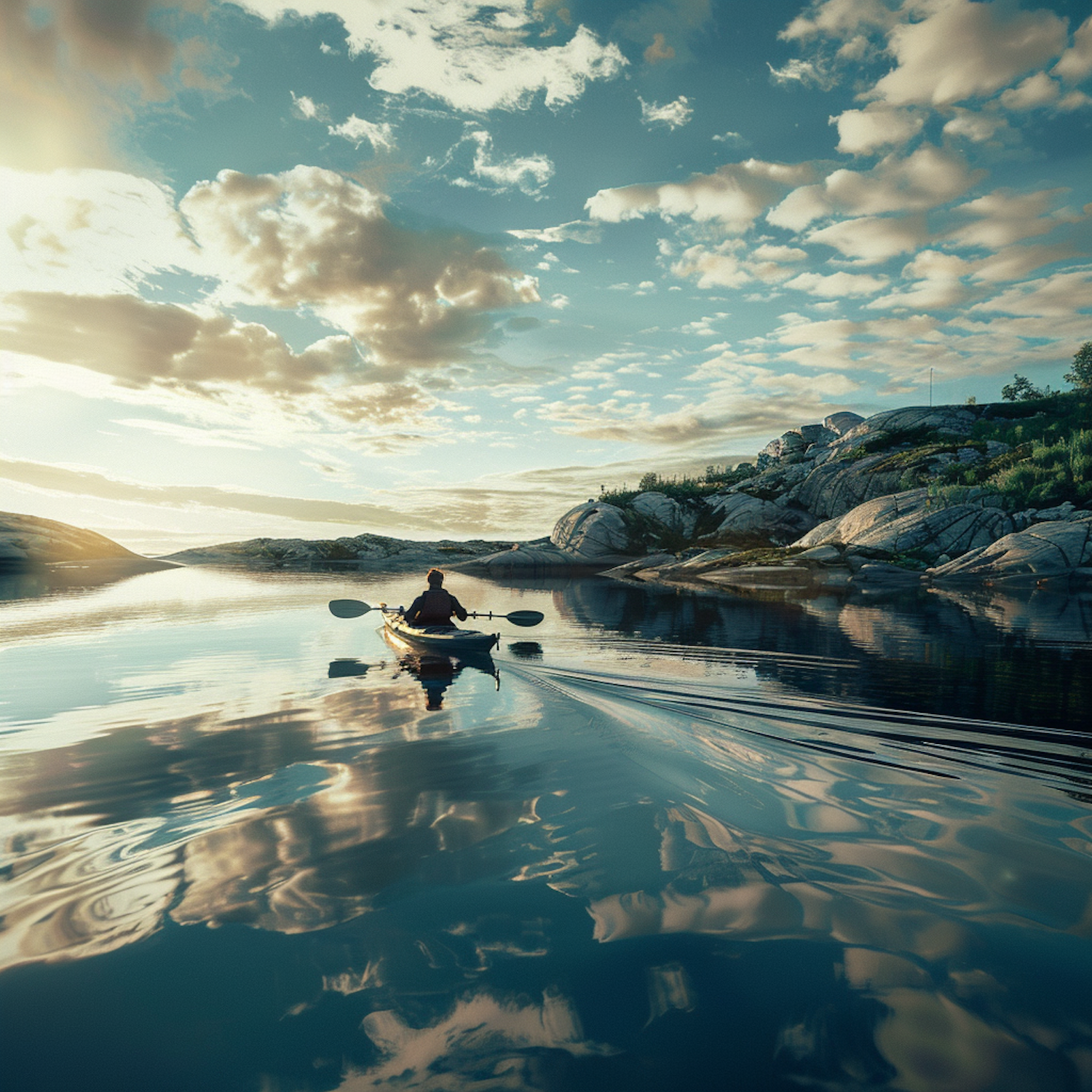 A kayaker glides through calm waters under a stunning sky, surrounded by rocky landscapes and lush greenery.