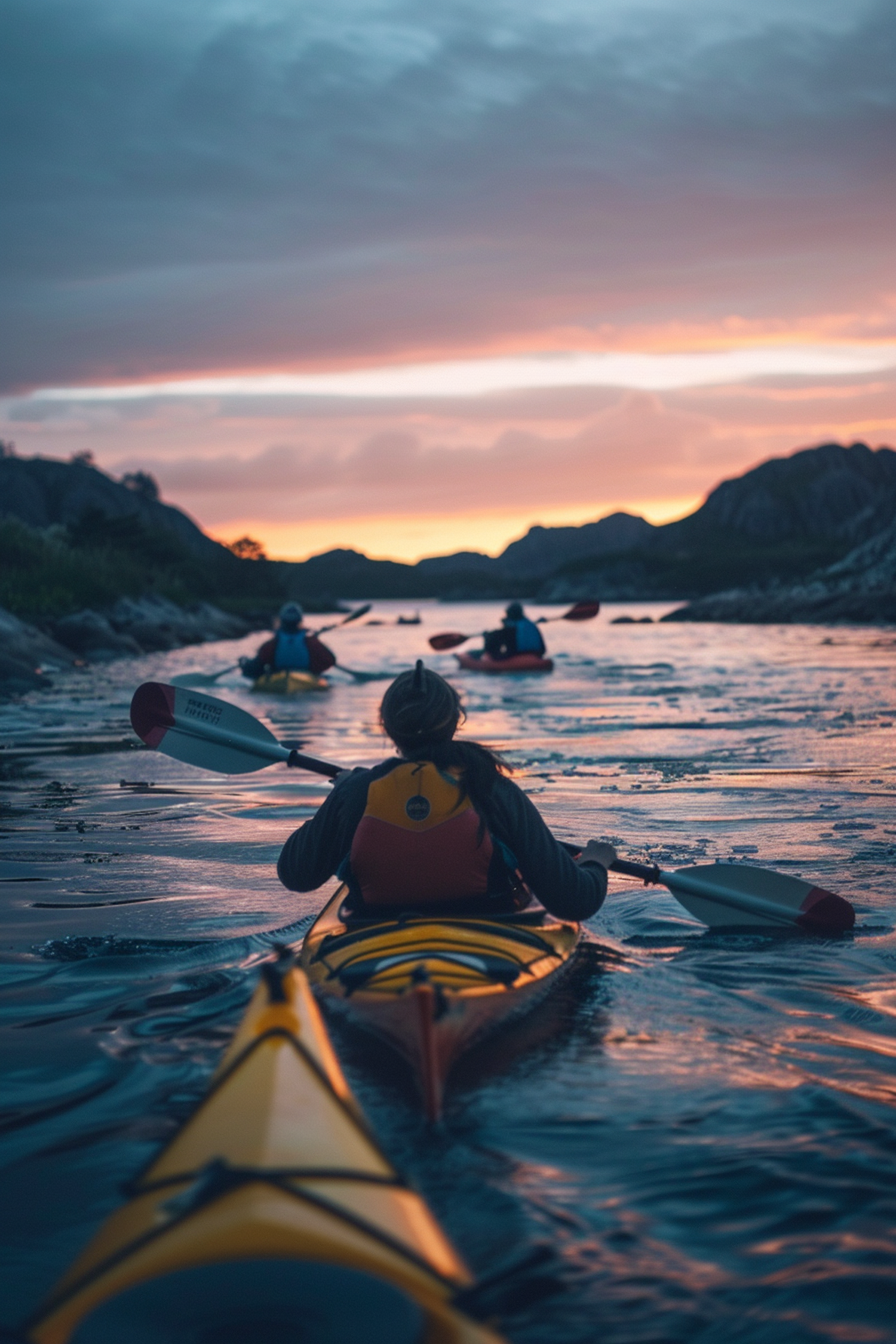 Kayakers paddle through a serene waterway at sunset, silhouetted against a vibrant sky with hues of orange and pink.