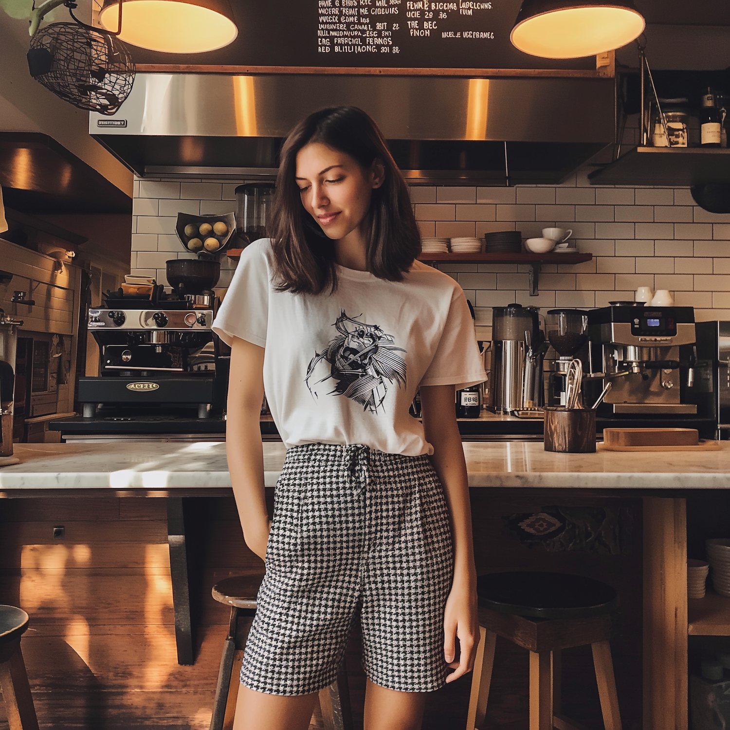 Young woman in a stylish cafe wearing a graphic tee and checkered shorts, surrounded by warm lighting and modern decor.