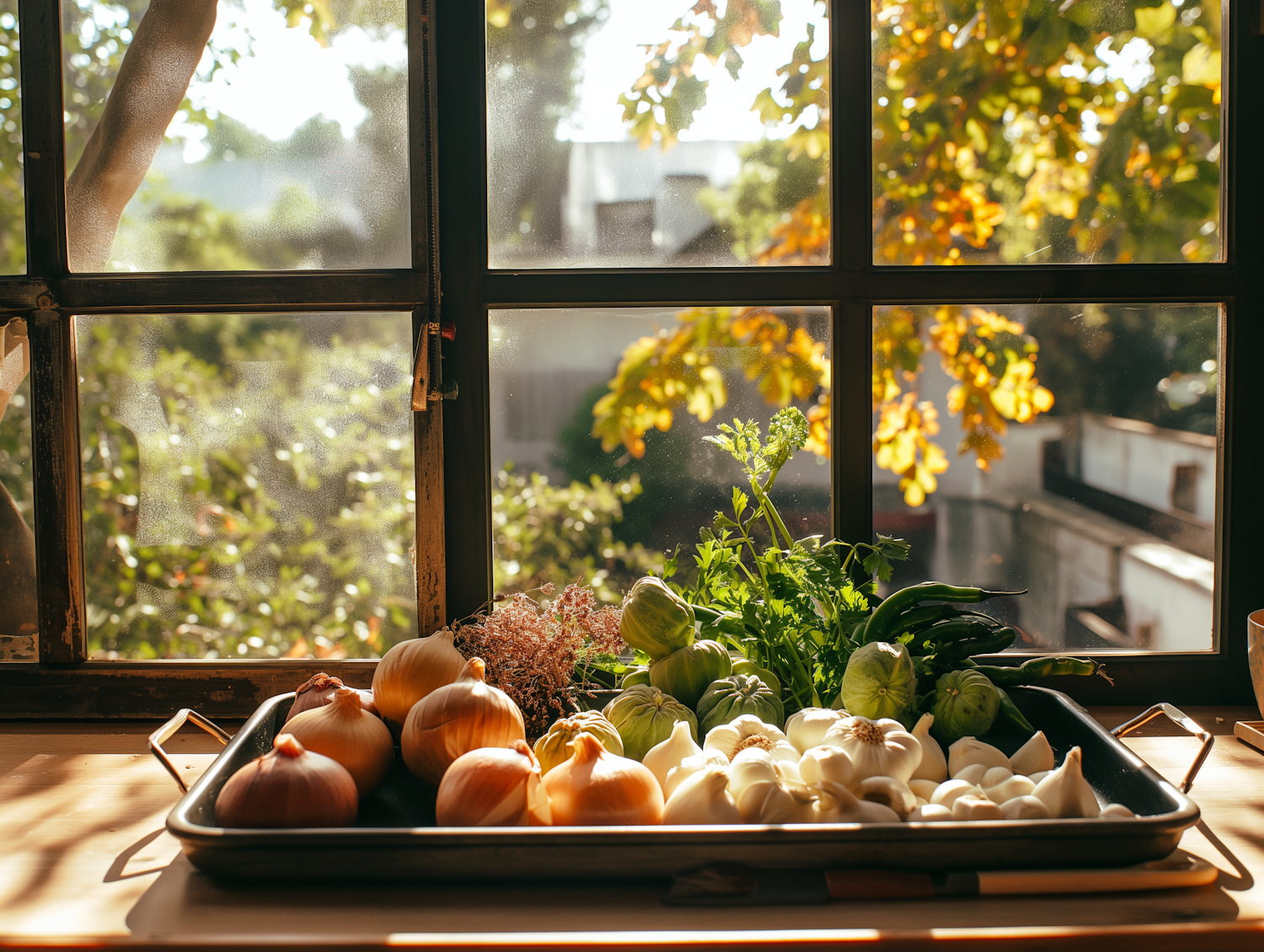 Sunlit kitchen with fresh vegetables on a tray, framed by a rustic window and autumn foliage outside.
