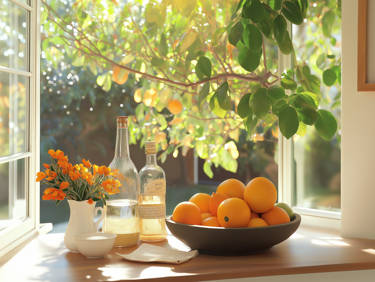 Sunlit kitchen window with oranges, glass bottles, and orange flowers, creating a warm, inviting atmosphere.