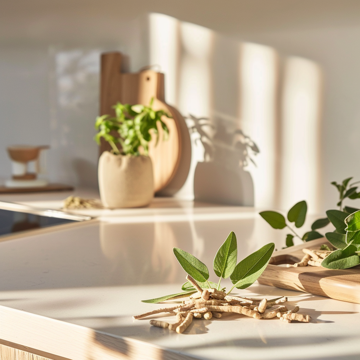 Sunlit kitchen counter with fresh herbs and roots, wooden cutting board, and potted plant, creating a warm, natural ambiance.