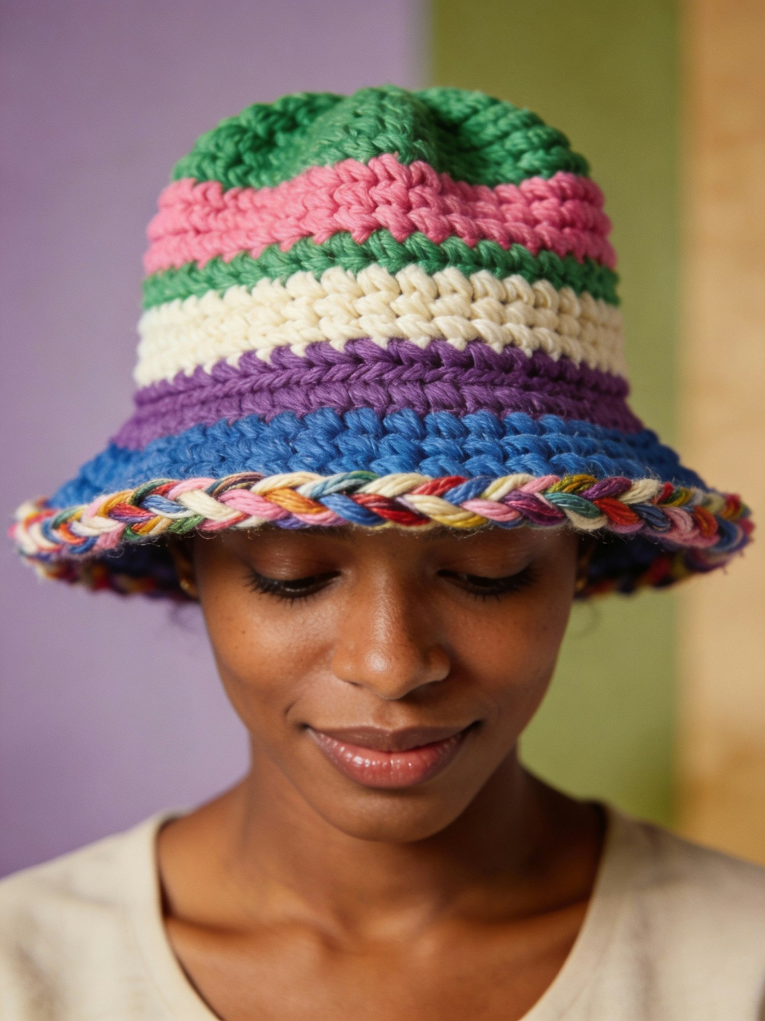 A serene woman wearing a colorful, hand-knitted hat with vibrant stripes and a braided brim, set against a soft pastel background.
