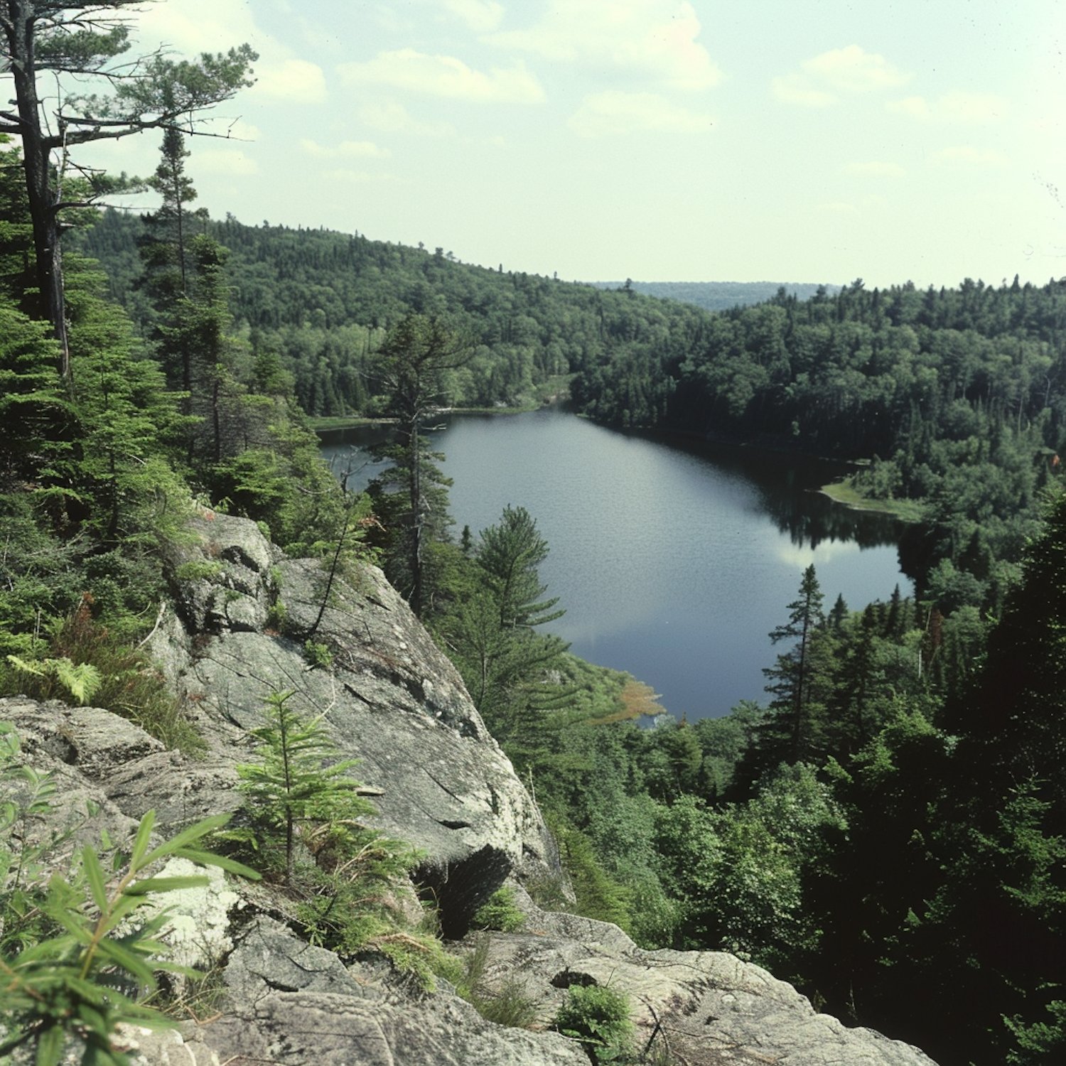 Tranquil lake surrounded by lush forest and rocky cliffs under a partly cloudy sky, reflecting serene wilderness beauty.