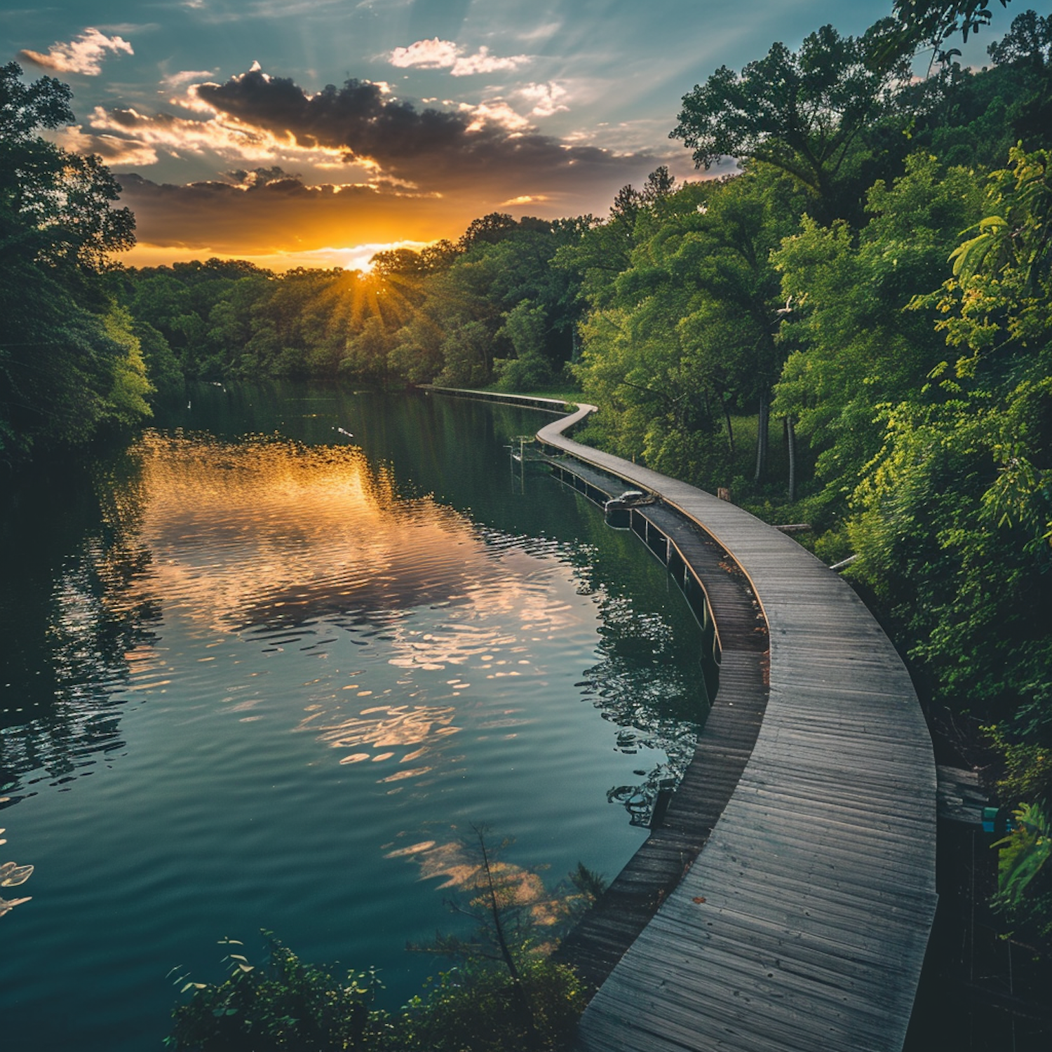 Scenic sunset over a tranquil lake with a winding boardwalk and lush greenery, reflecting vibrant colors in the water.