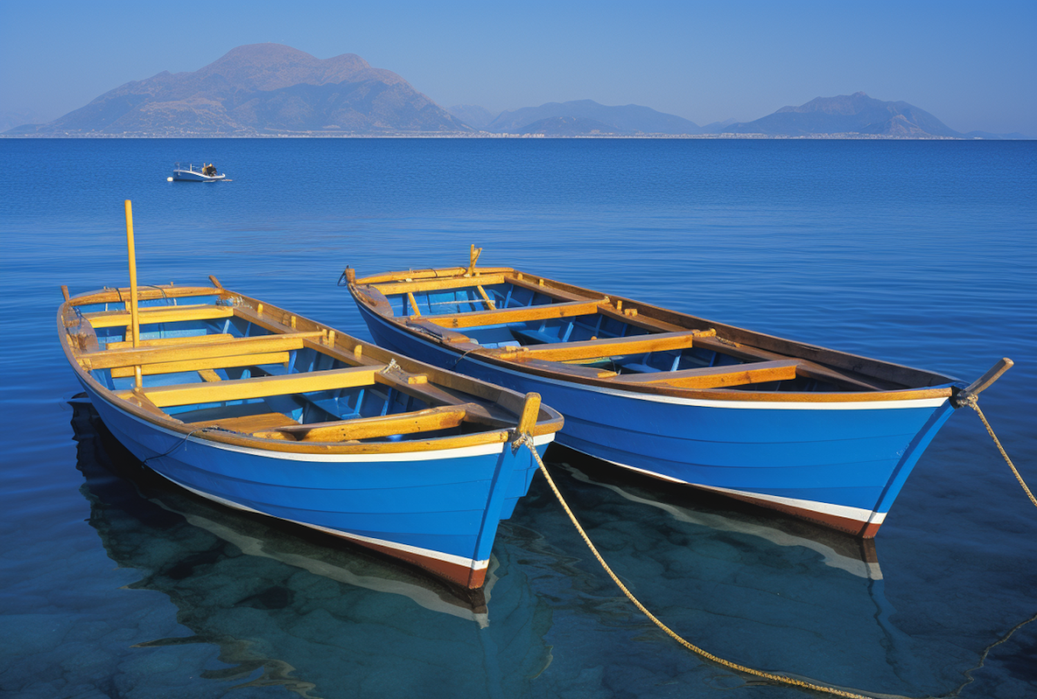 Two blue wooden boats moored in clear water with distant mountains and a serene sky, creating a tranquil coastal scene.