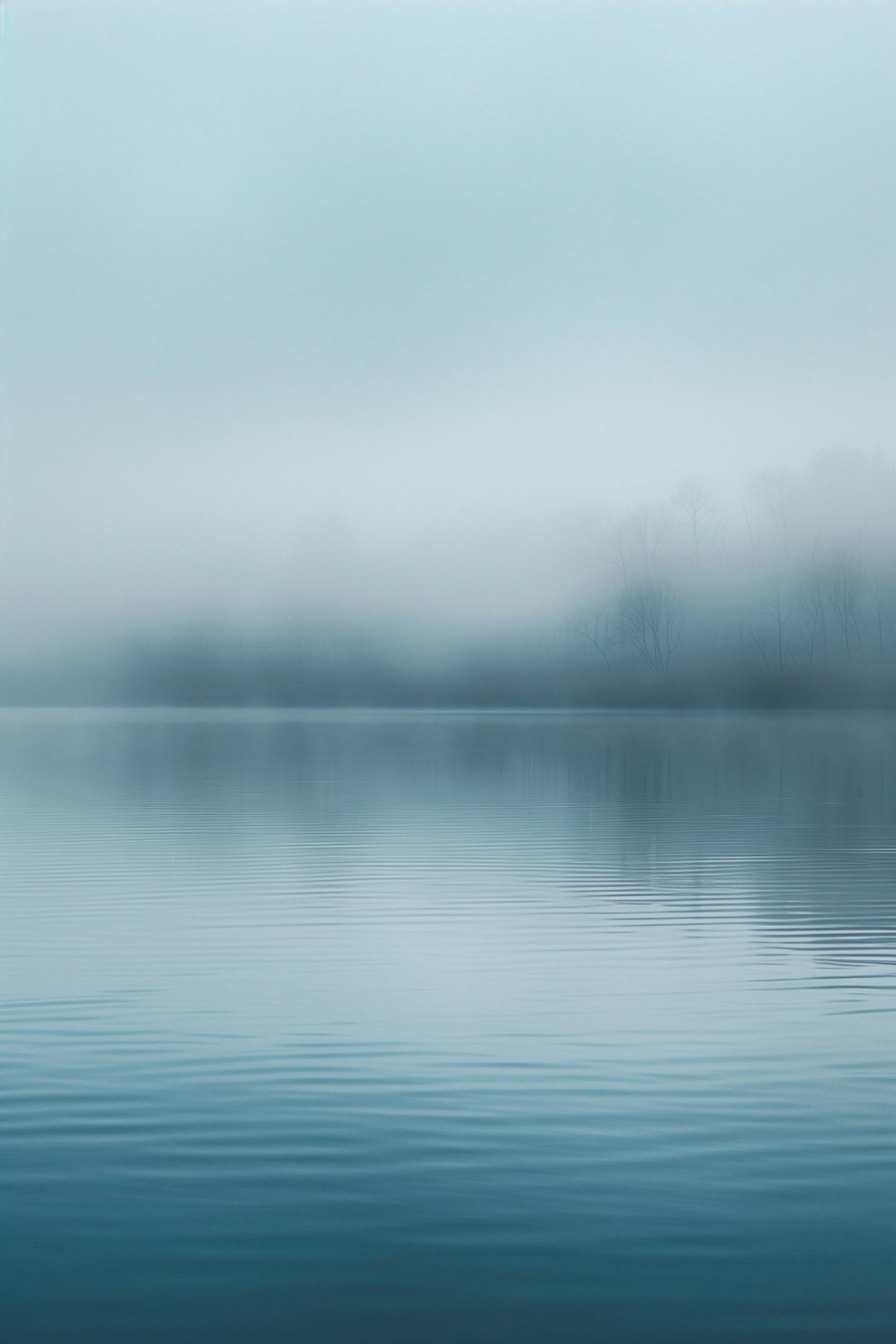 Misty landscape with calm blue water and foggy trees in the background, creating a serene and tranquil atmosphere.