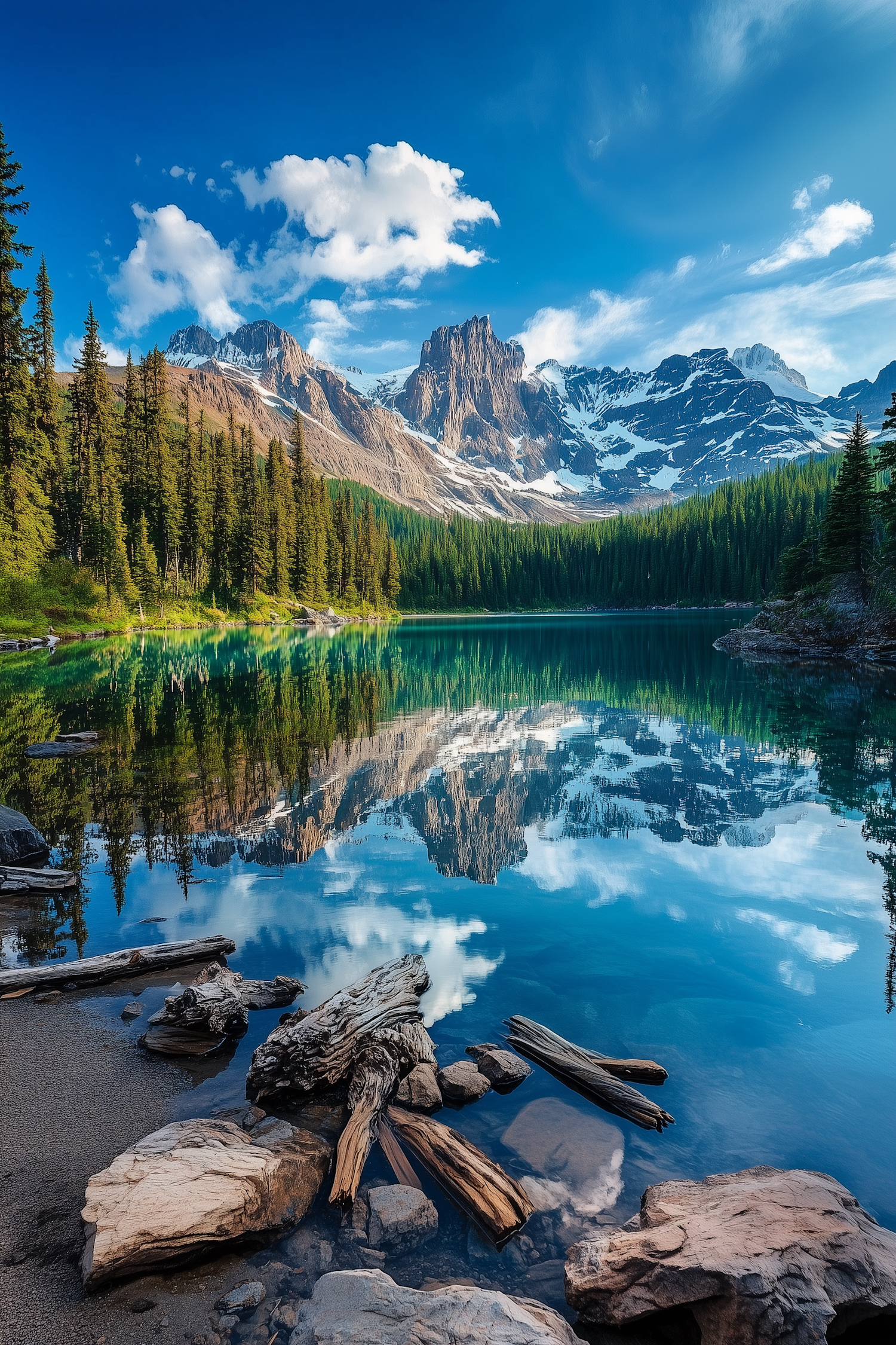 Stunning mountain landscape with snow-capped peaks, a reflective lake, and lush forests under a clear blue sky.