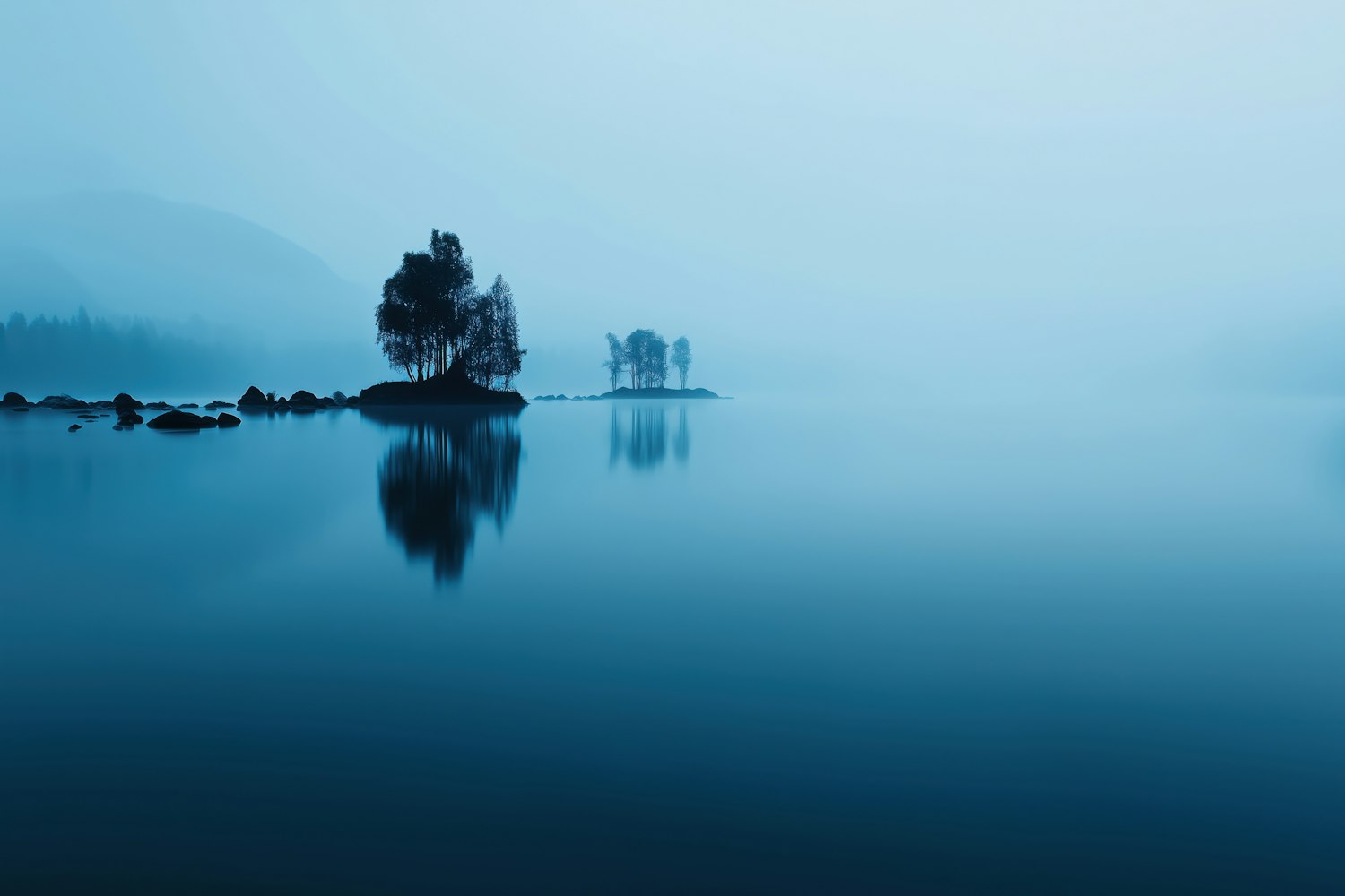 A tranquil lake with small tree-covered islands, misty hills in the background, and serene blue tones reflecting calmness.