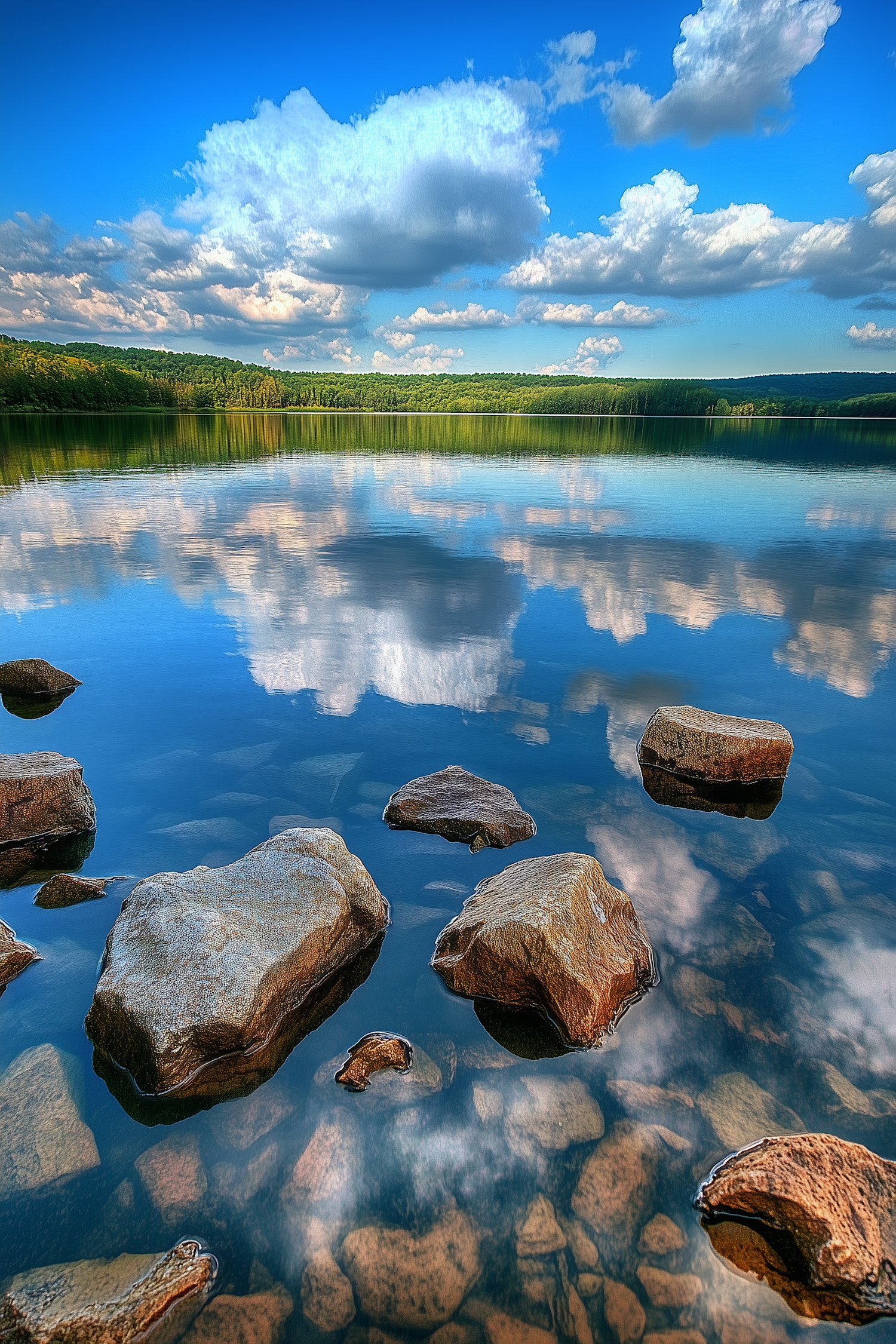Tranquil lake with clear reflections of clouds and sky, surrounded by lush greenery and smooth rocks in the foreground.