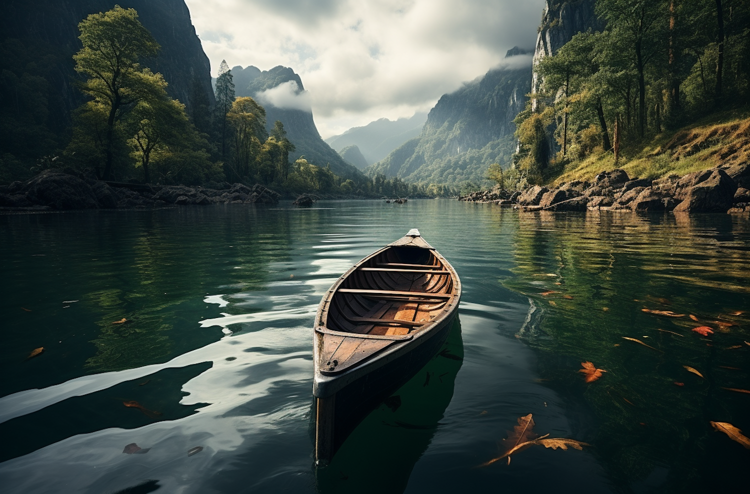 A wooden boat on a tranquil lake surrounded by misty mountains and autumn foliage, creating a serene and picturesque scene.