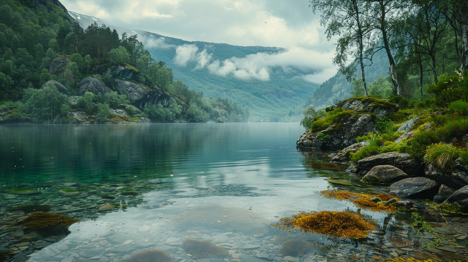 Tranquil lake with clear water, lush greenery, rocky shoreline, and misty mountains in the background under an overcast sky.