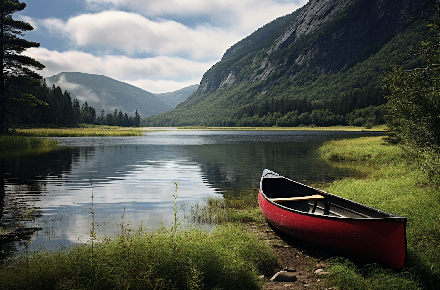 Serene lake scene with a red canoe on the shore, surrounded by lush green mountains and a calm, reflective water surface.