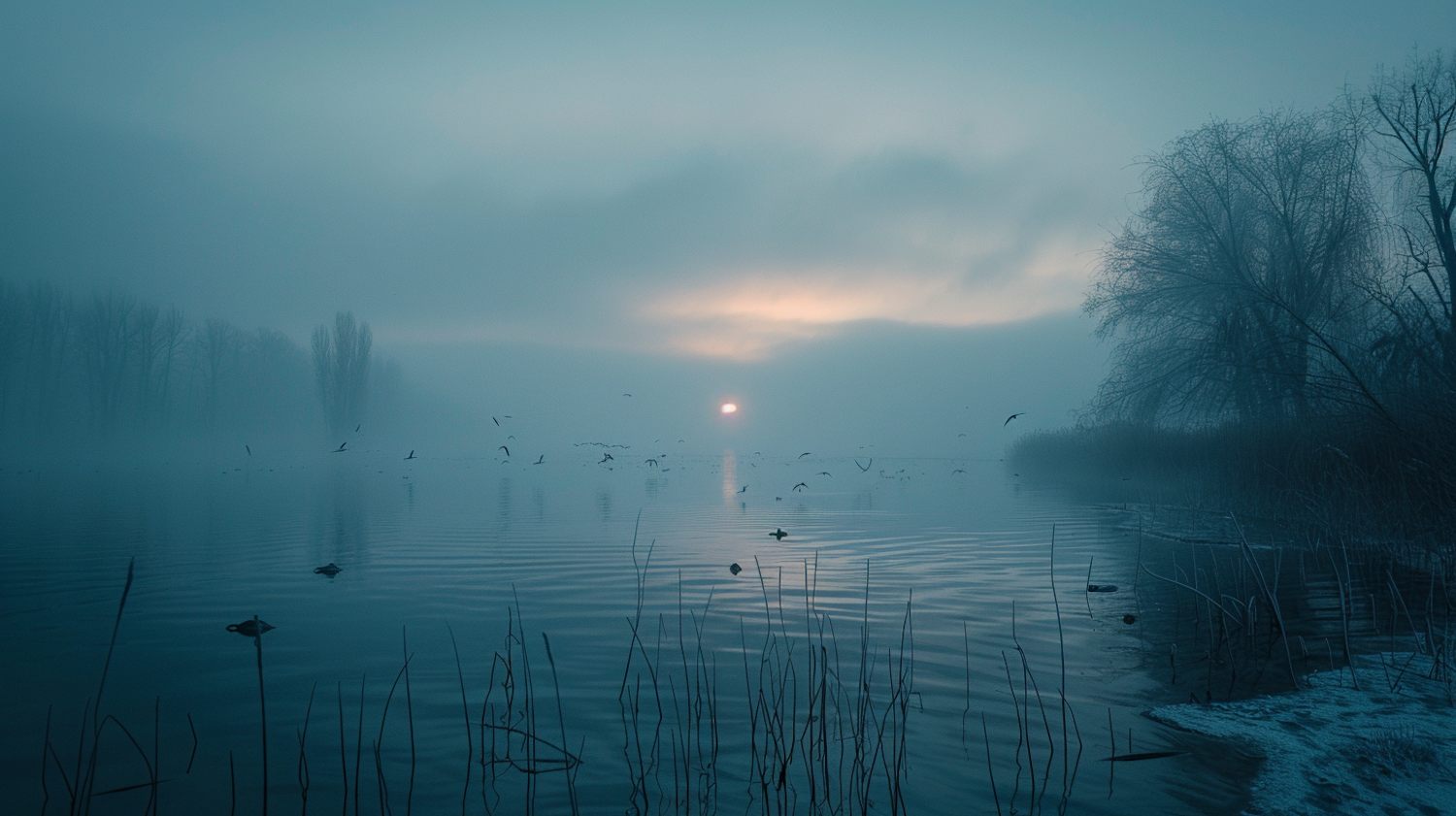 Misty lake at sunrise with birds in flight, bare trees, and serene reflections. A tranquil scene in cool blue tones.