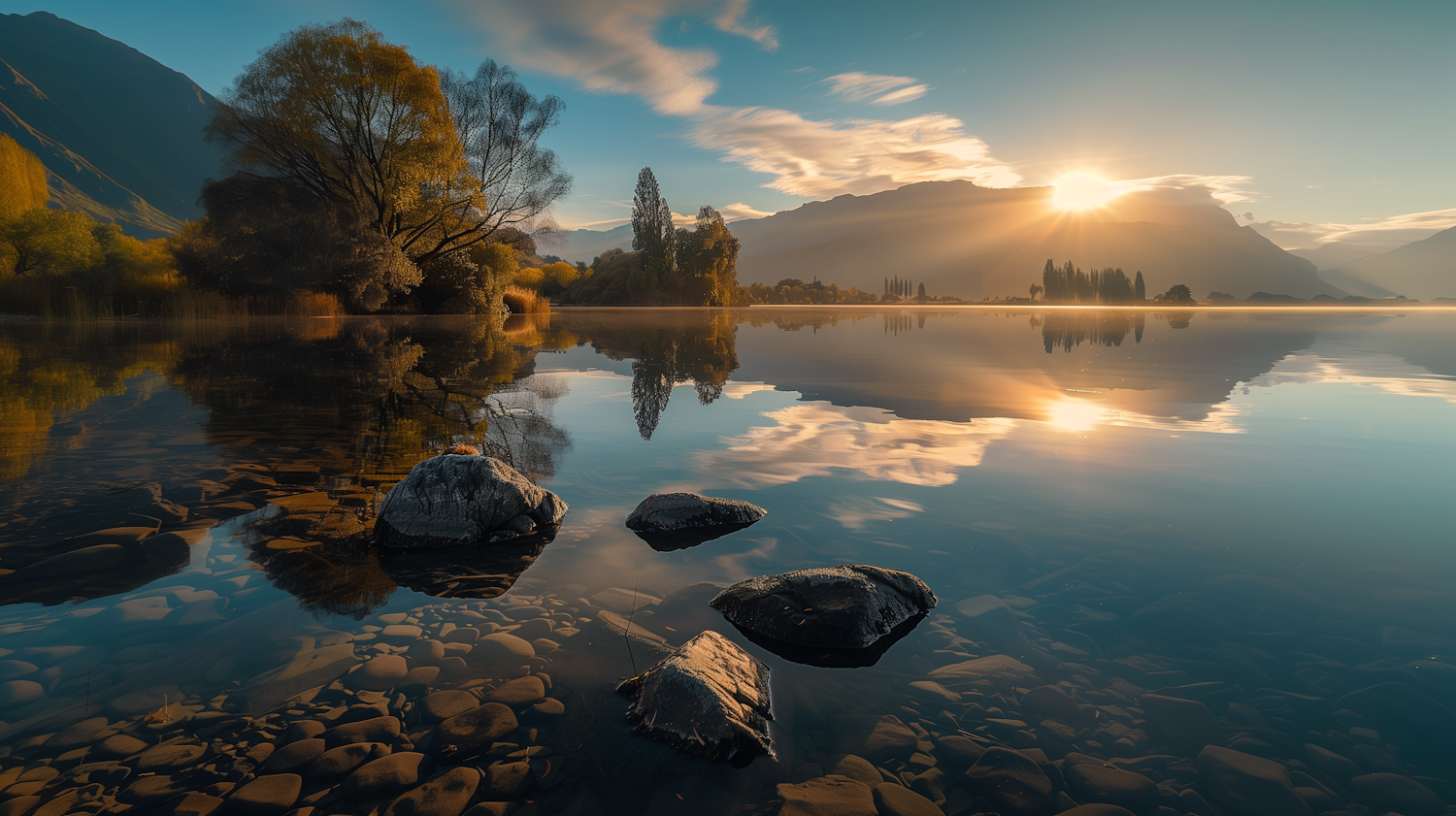 Tranquil lake at sunrise with mountains, trees, and reflections. Warm golden light and clear water create a serene, peaceful scene.