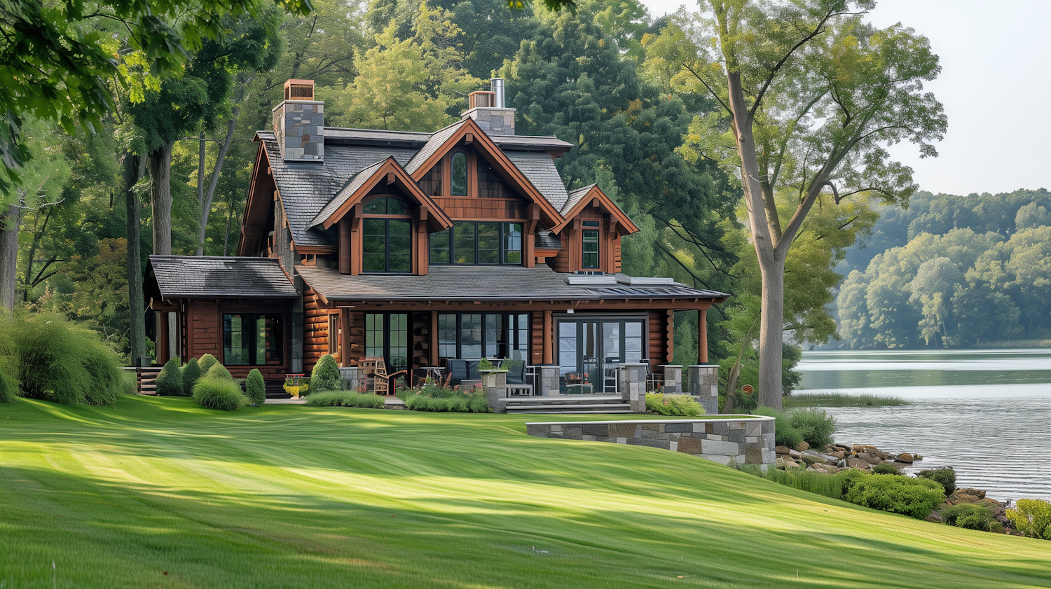 Charming log cabin by a serene lake, surrounded by lush greenery and a manicured lawn, perfect for a tranquil retreat.