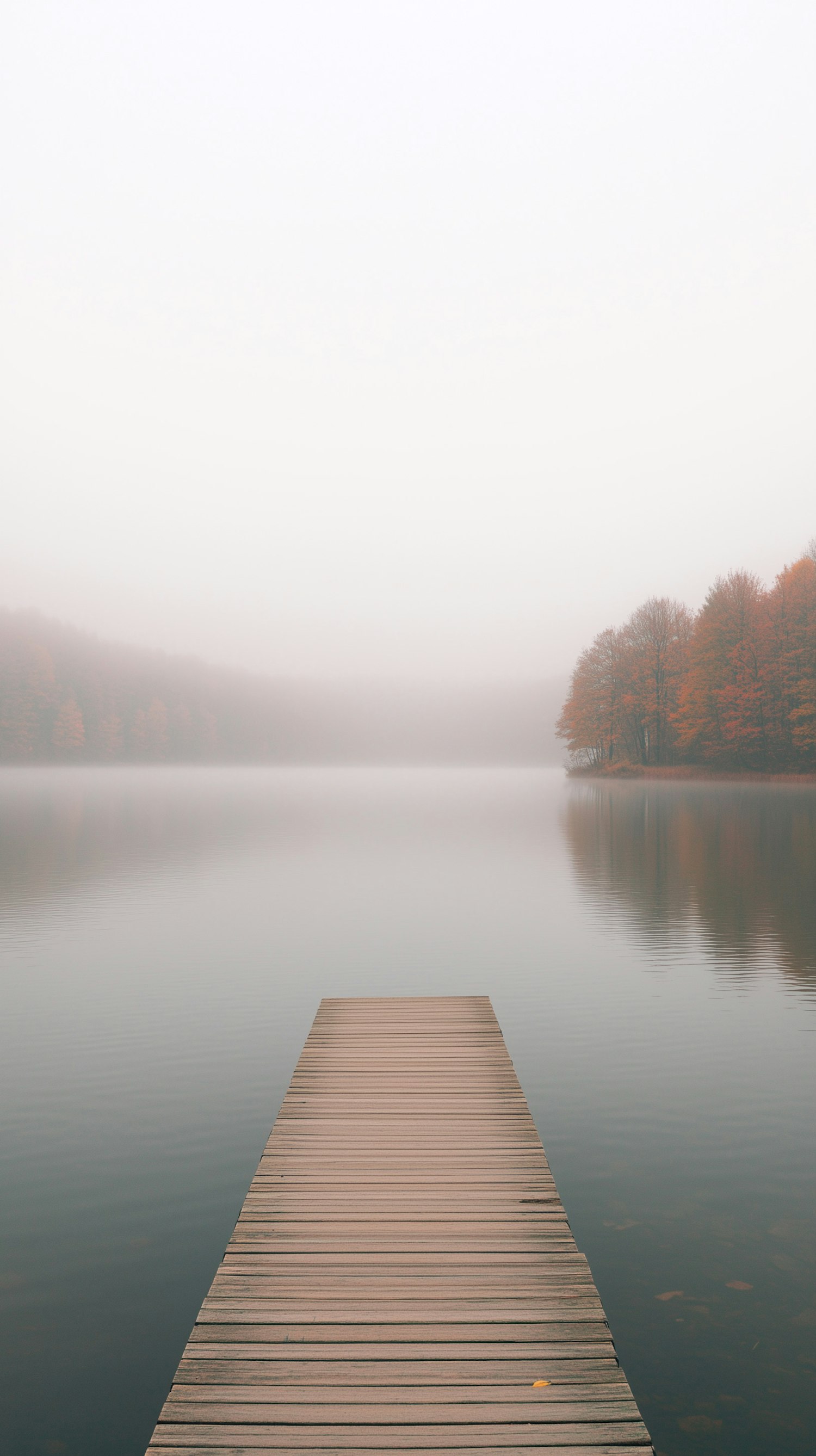 Serene misty lake with a wooden dock and autumn trees, creating a tranquil and ethereal atmosphere.