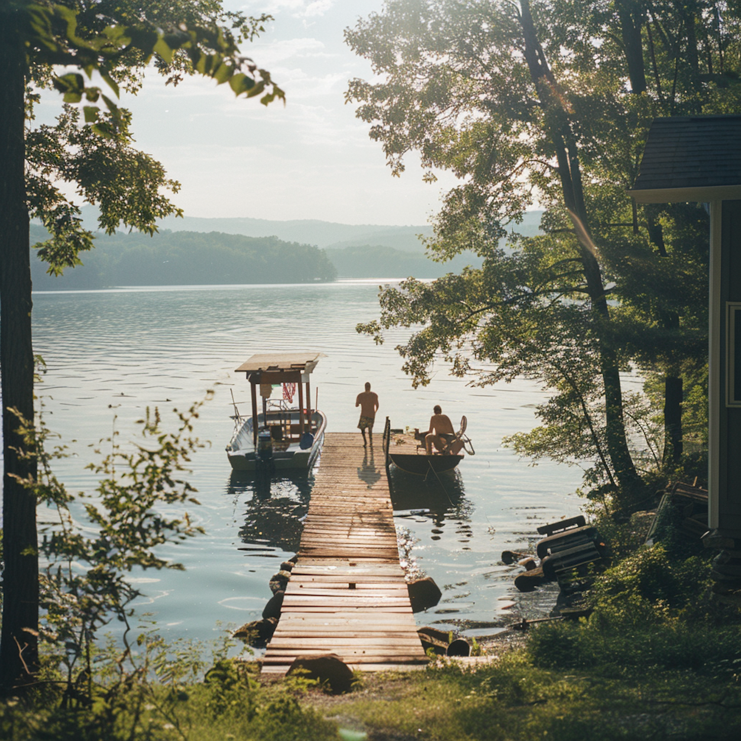 Tranquil lakeside scene with a wooden dock, two boats, and people enjoying the serene water and lush greenery.