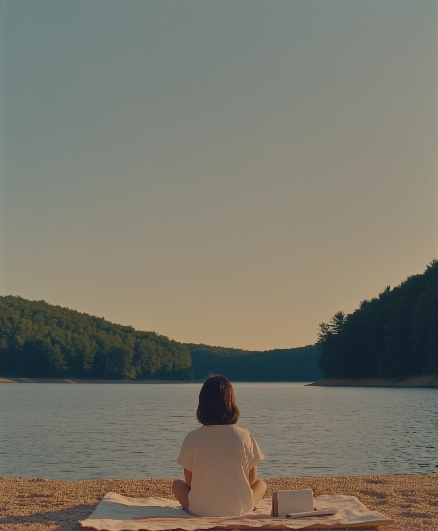 Person sitting on a beach, facing a serene lake surrounded by forests, with an open book beside them. Tranquil and contemplative scene.