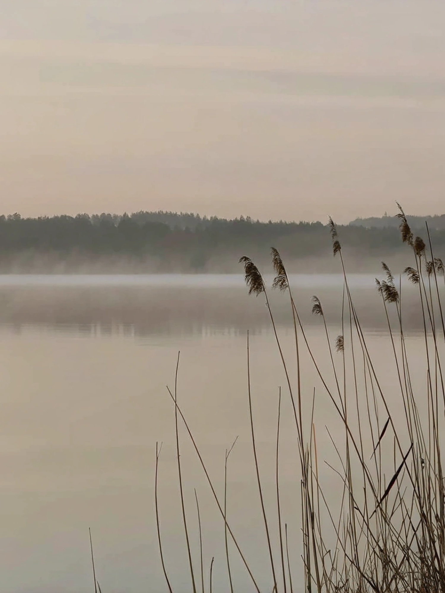 Tranquil lakeside view with misty water, tall reeds in the foreground, and a silhouette of trees under a soft, overcast sky.
