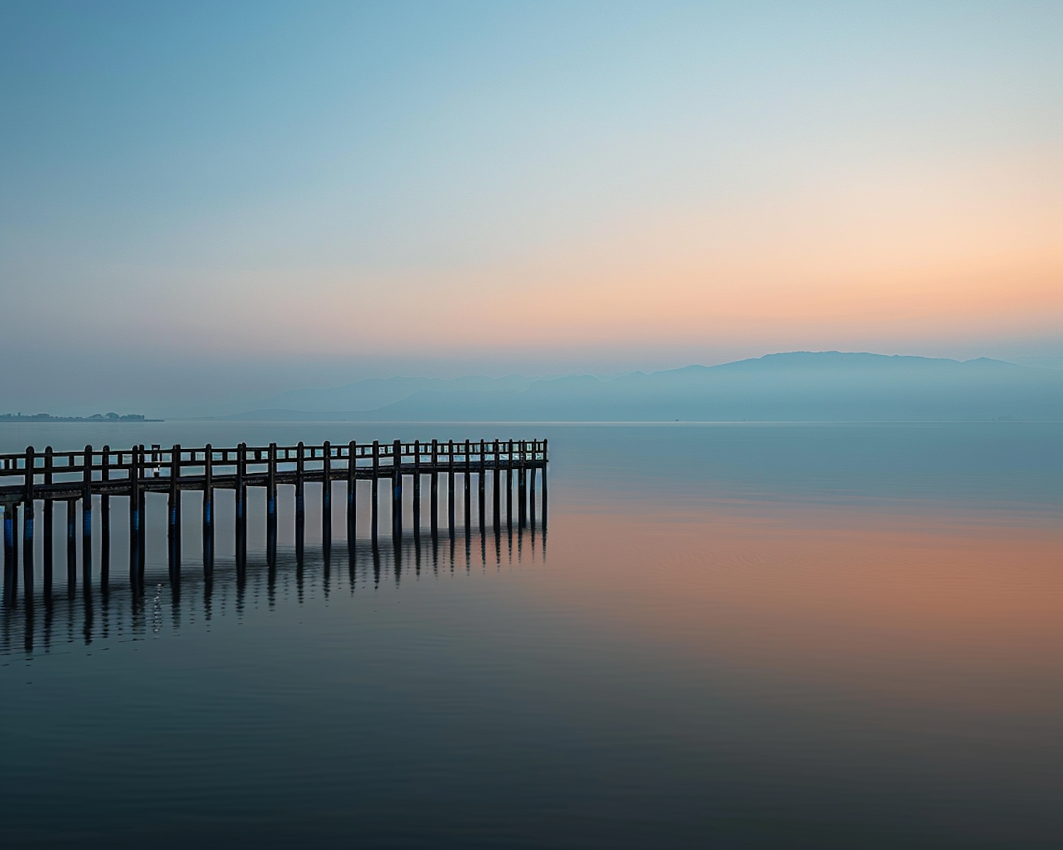 Tranquil pier extending into calm waters with a serene sunset backdrop and misty mountains in the distance.