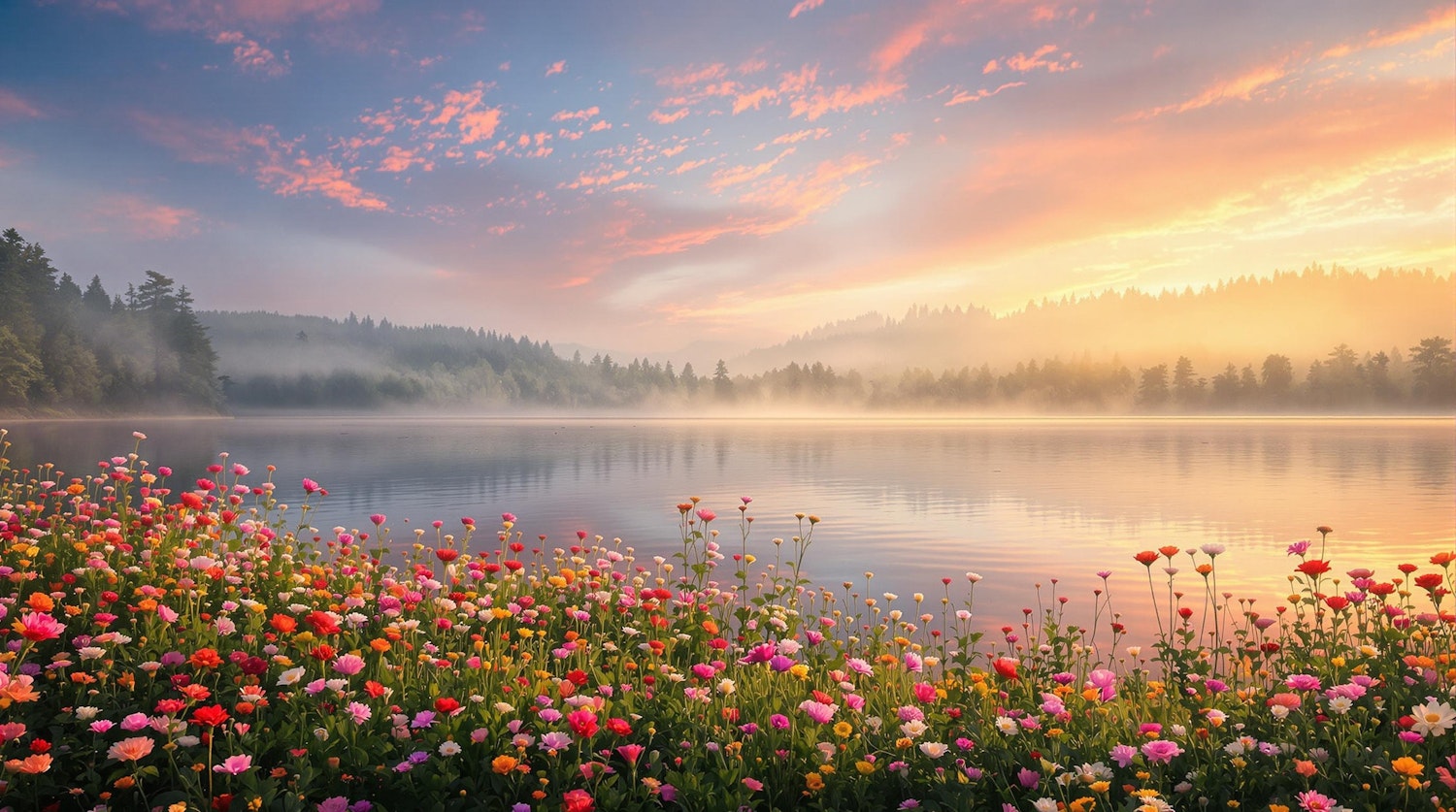 A tranquil lake at sunrise with colorful wildflowers in the foreground, misty water, and a forested backdrop under a pastel sky.