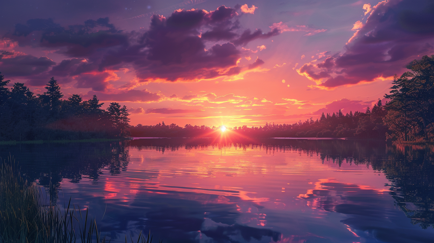 Stunning sunset over a serene lake with vibrant pink and orange clouds reflecting on the water, surrounded by silhouetted trees.