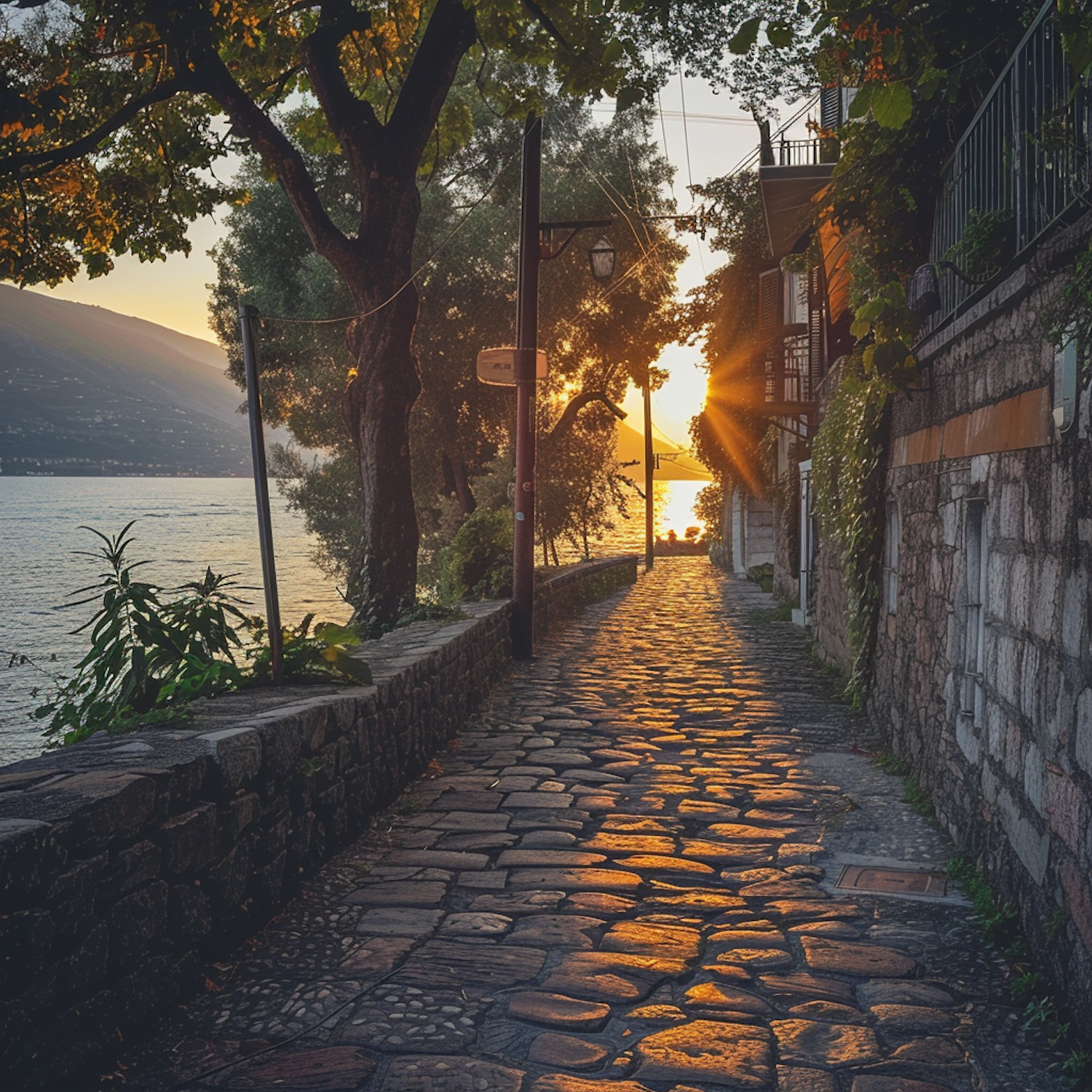 Cobblestone path leading to a sunset over water, flanked by trees and ivy-covered buildings, with warm golden light reflecting on stones.