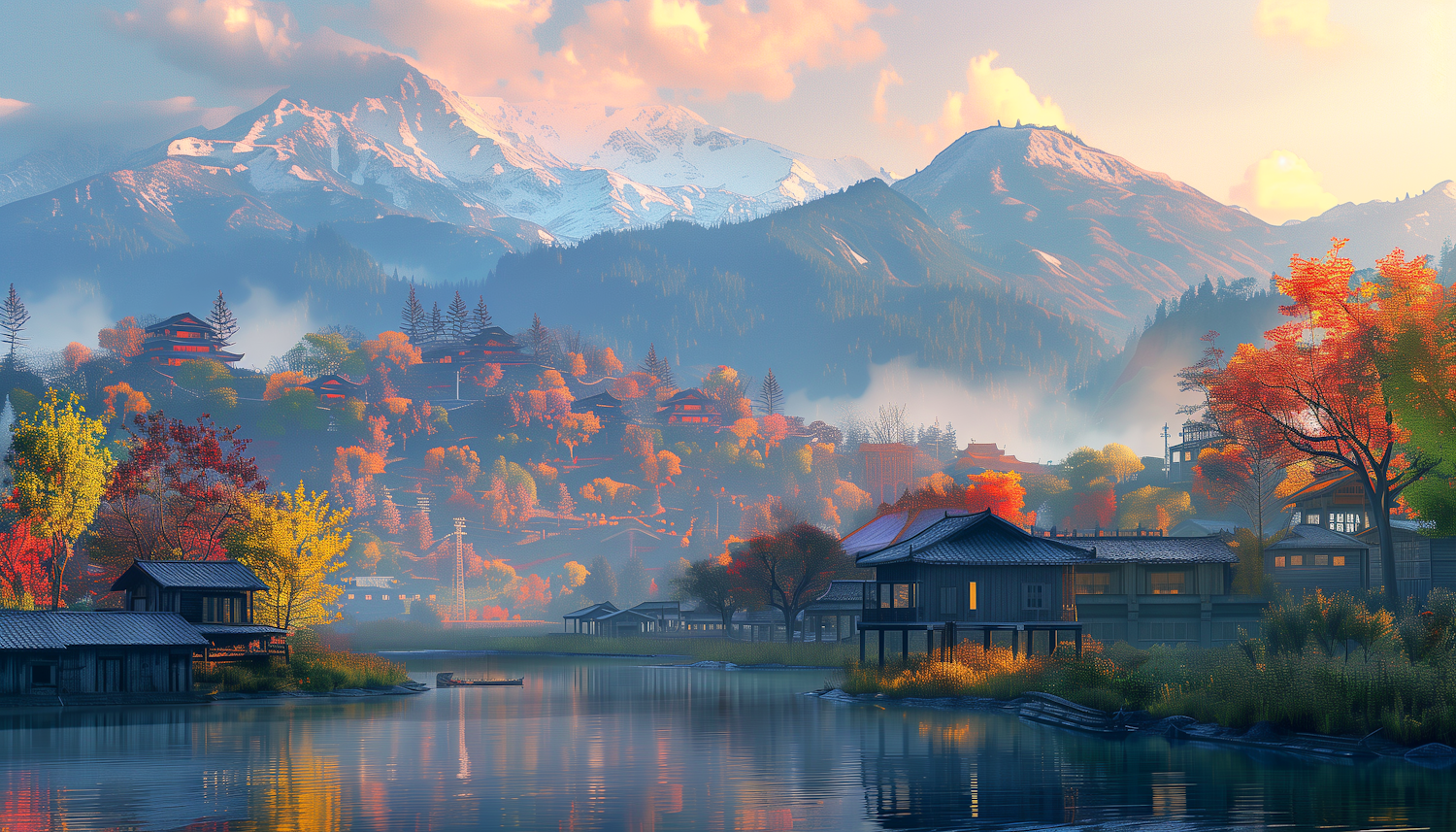Tranquil autumn landscape with vibrant foliage, traditional houses, and snow-capped mountains reflected in a serene lake.