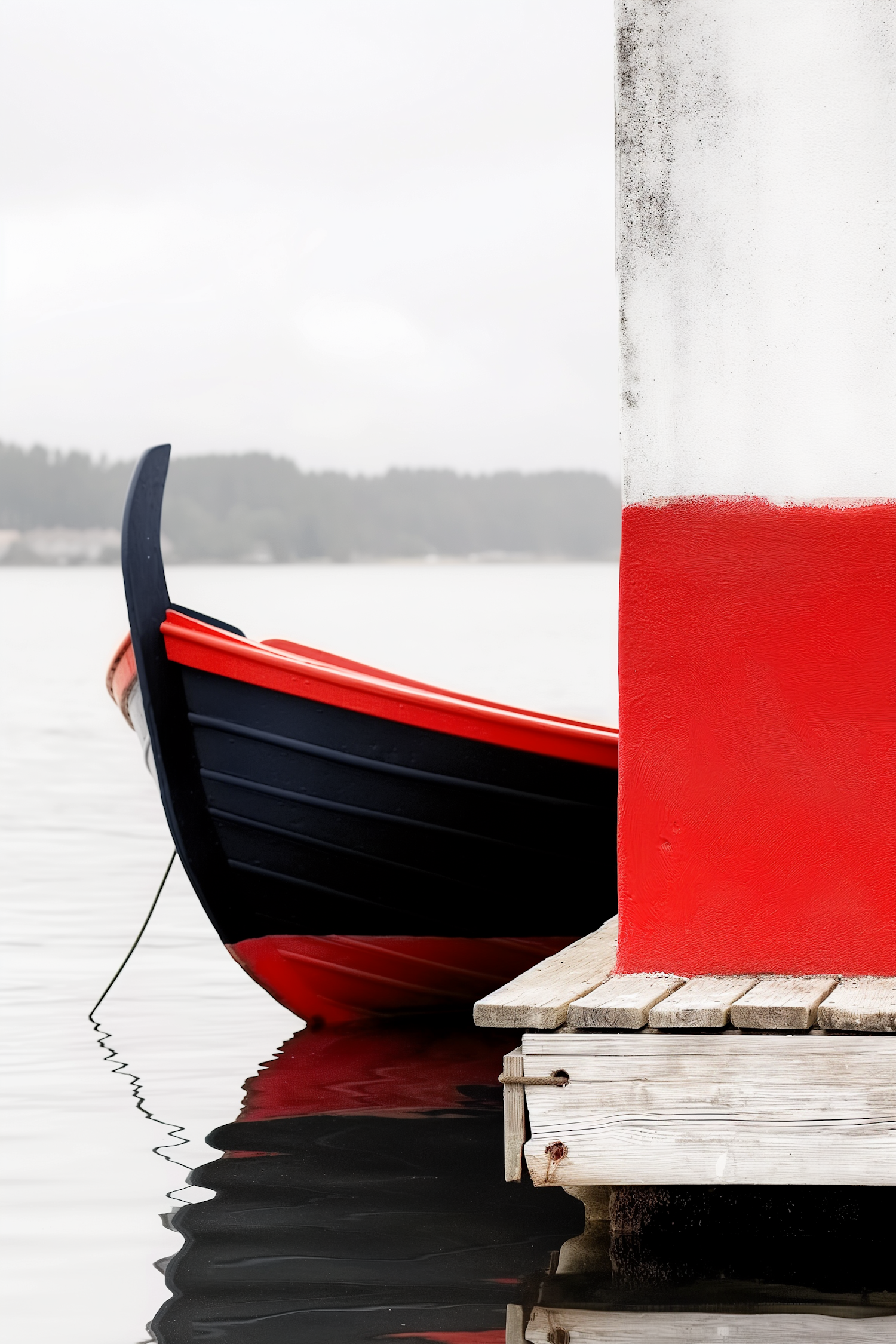 A red and black boat docked by a red and white pier, reflecting on calm water with a blurred forest backdrop.