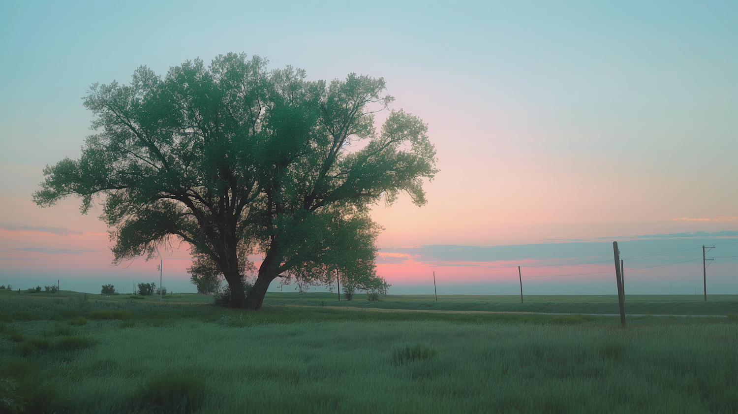 A solitary tree in a serene field at dawn or dusk, with pastel skies and distant utility poles, creating a tranquil landscape.