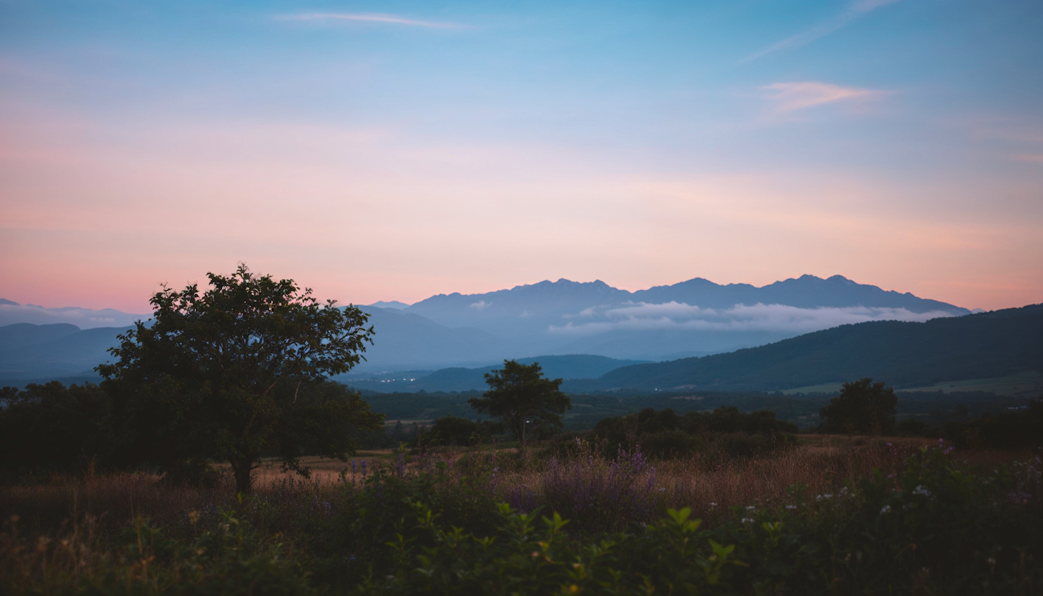 Serene landscape with a tree, misty hills, and mountains under a pink and blue sky, evoking tranquility and natural beauty.