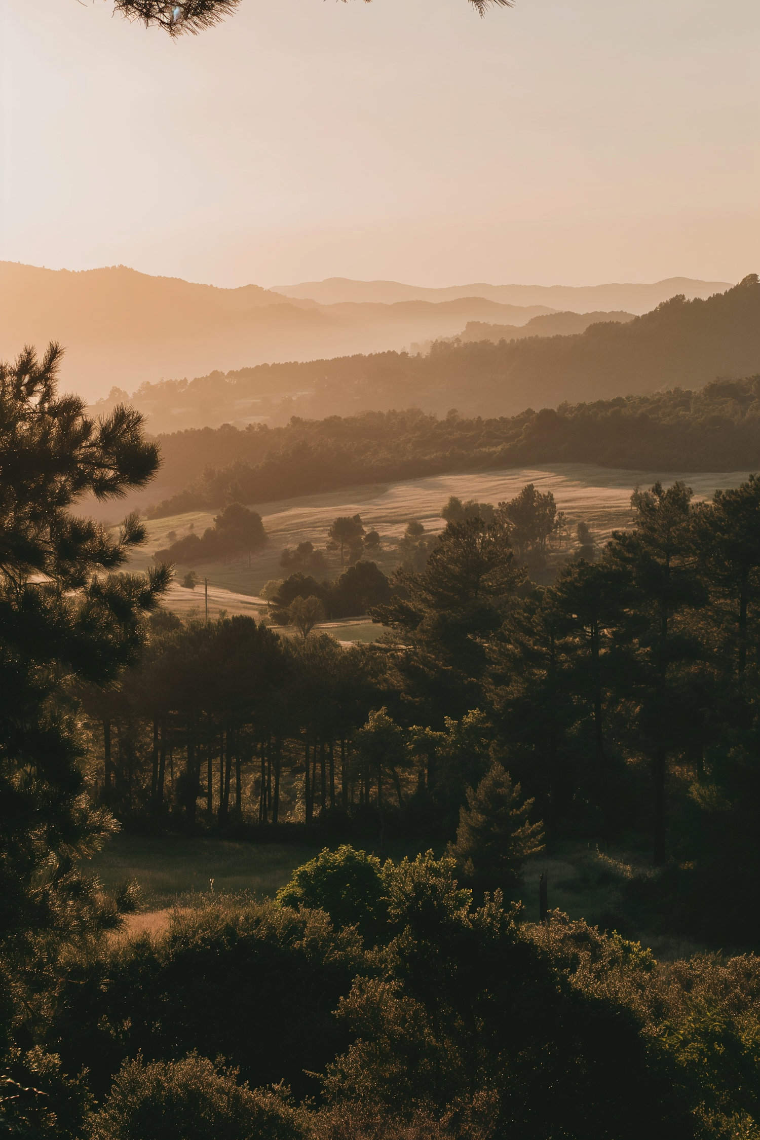 Tranquil sunset over rolling hills and dense forest, with a warm orange sky and serene atmosphere.