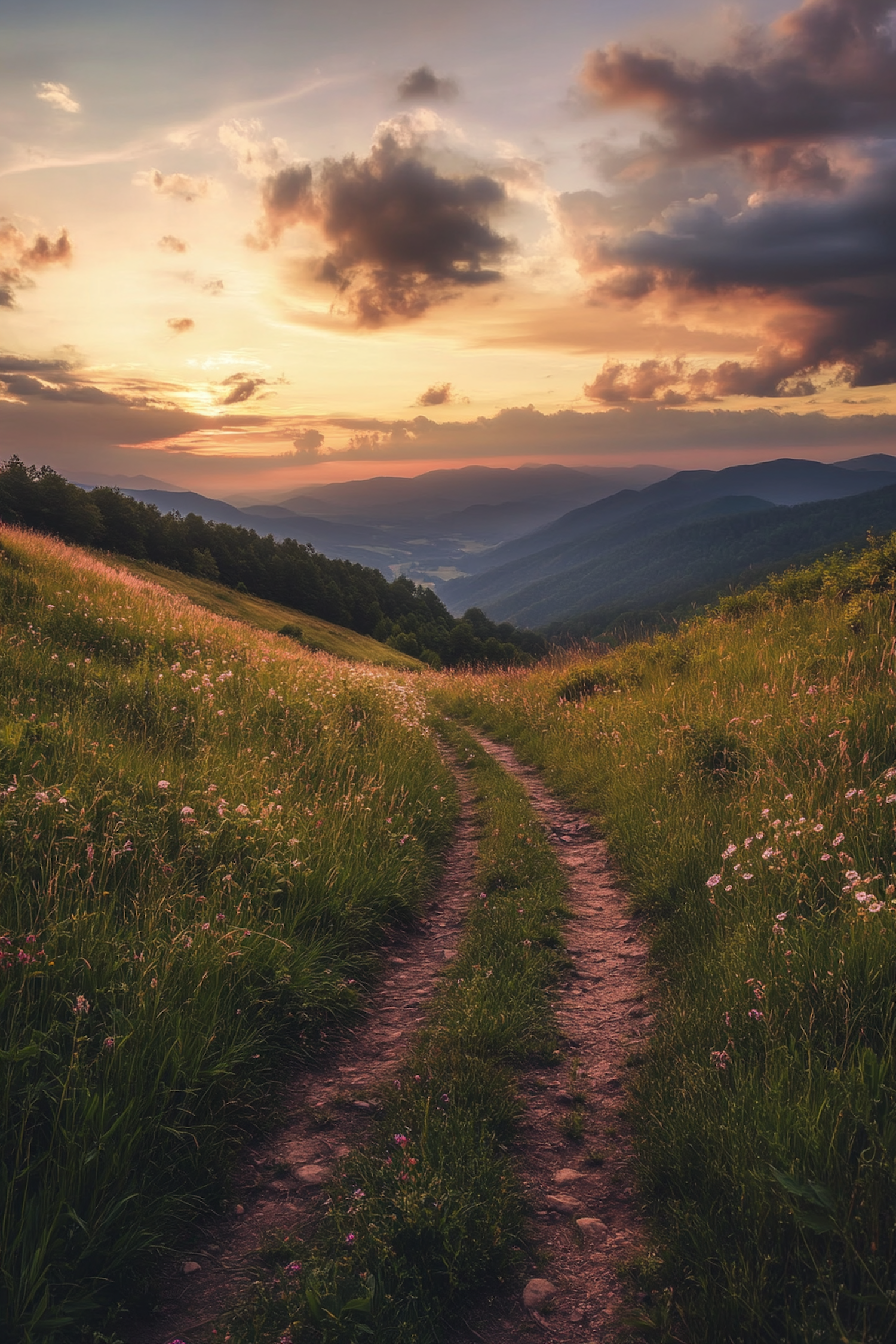 Serene sunset over a winding path through lush meadows and distant hills, with vibrant skies and wildflowers.