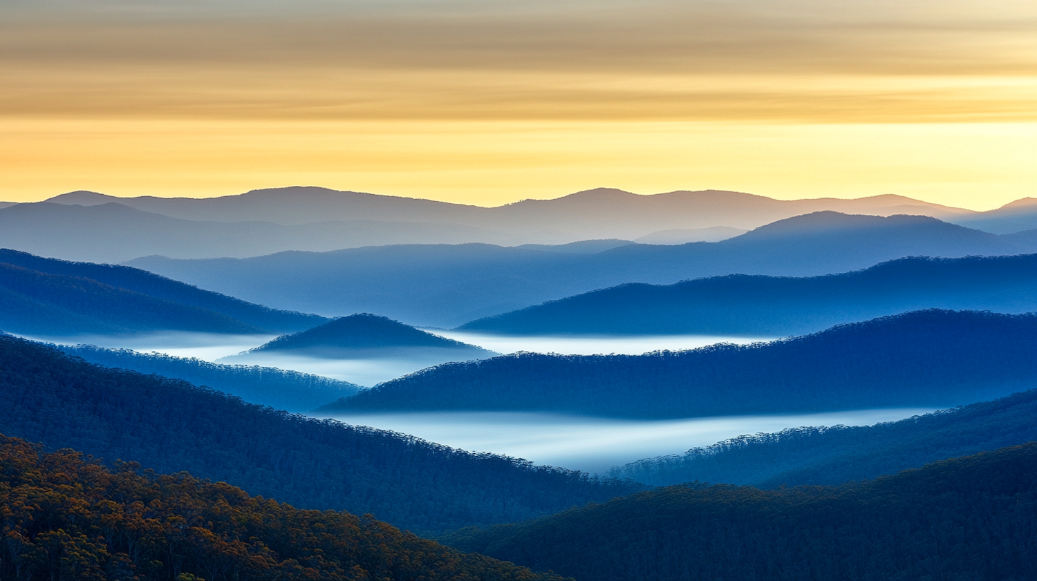 Serene landscape of blue and green hills under a golden sky, with misty clouds adding a mystical touch. Perfect for nature lovers.