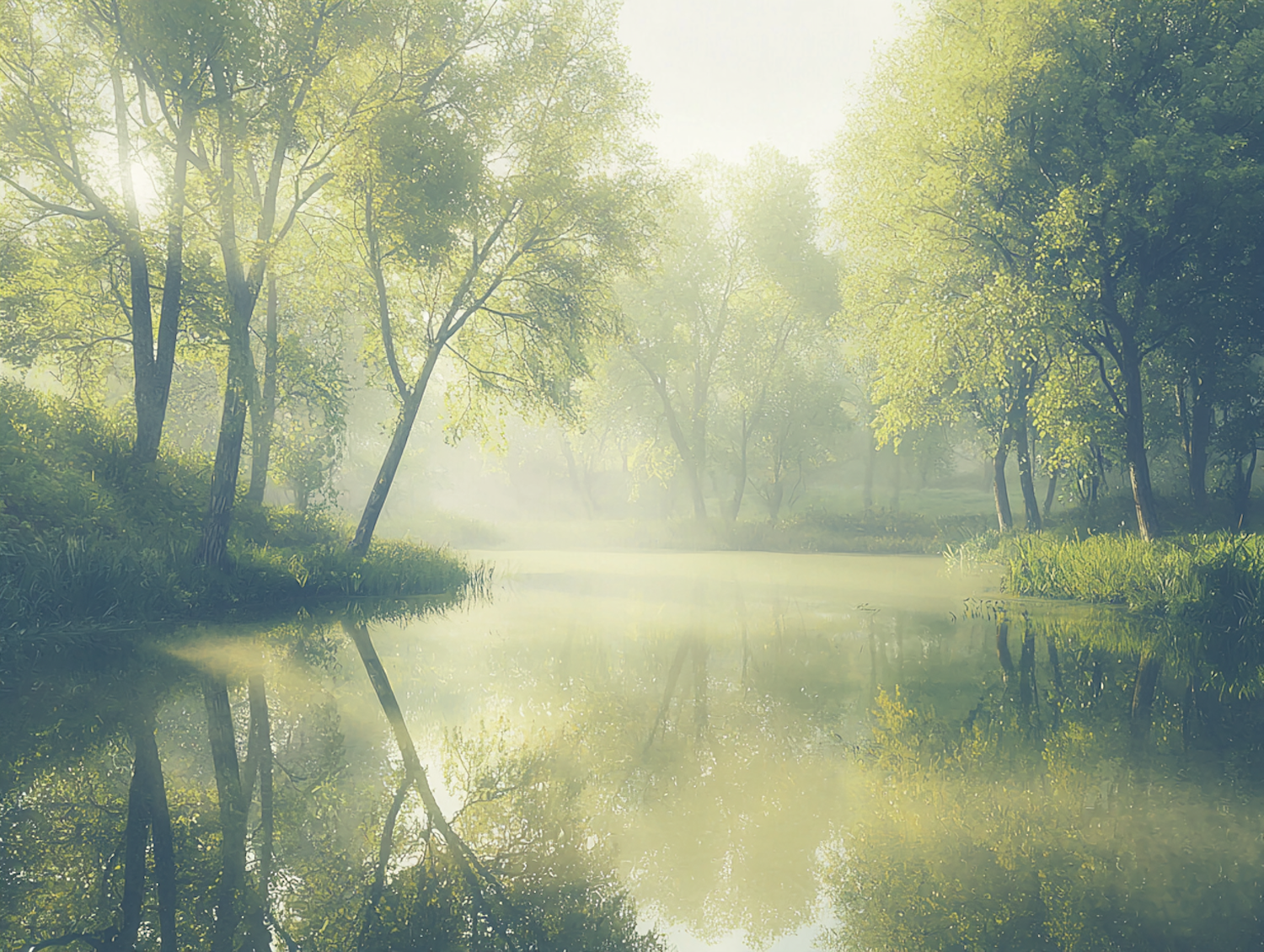 Tranquil forest scene with sunlight filtering through trees, reflecting on a calm, misty lake. Perfect for nature and relaxation lovers.