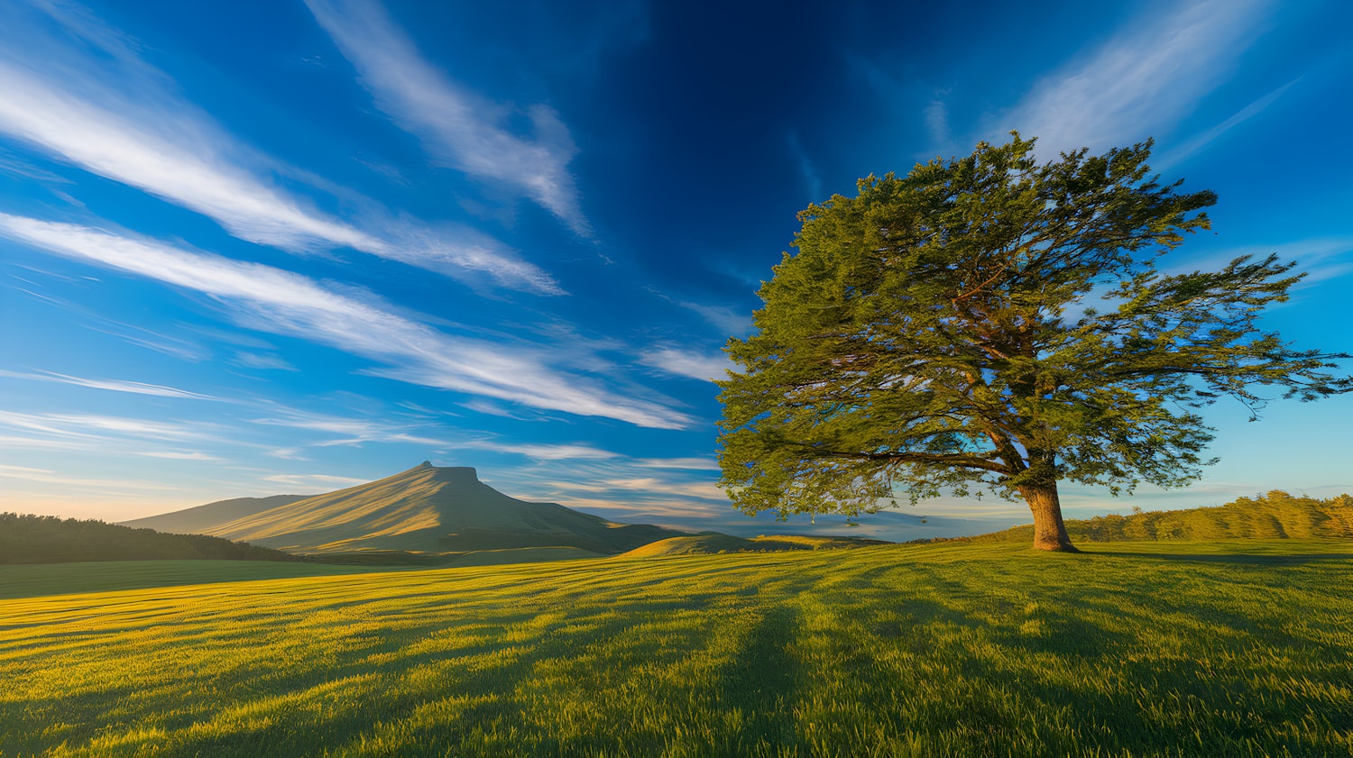 A peaceful green field with a lone tree, a mountain in the background, and a vibrant blue sky with streaky white clouds.
