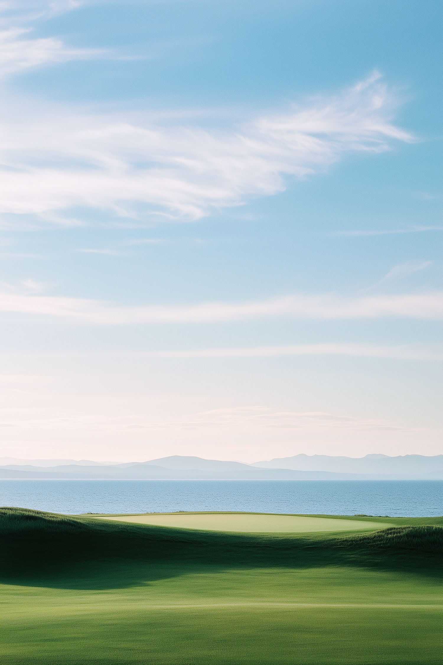 Peaceful landscape with green fields, a calm blue sea, distant mountains, and a bright sky with wispy clouds. Perfect for nature lovers.