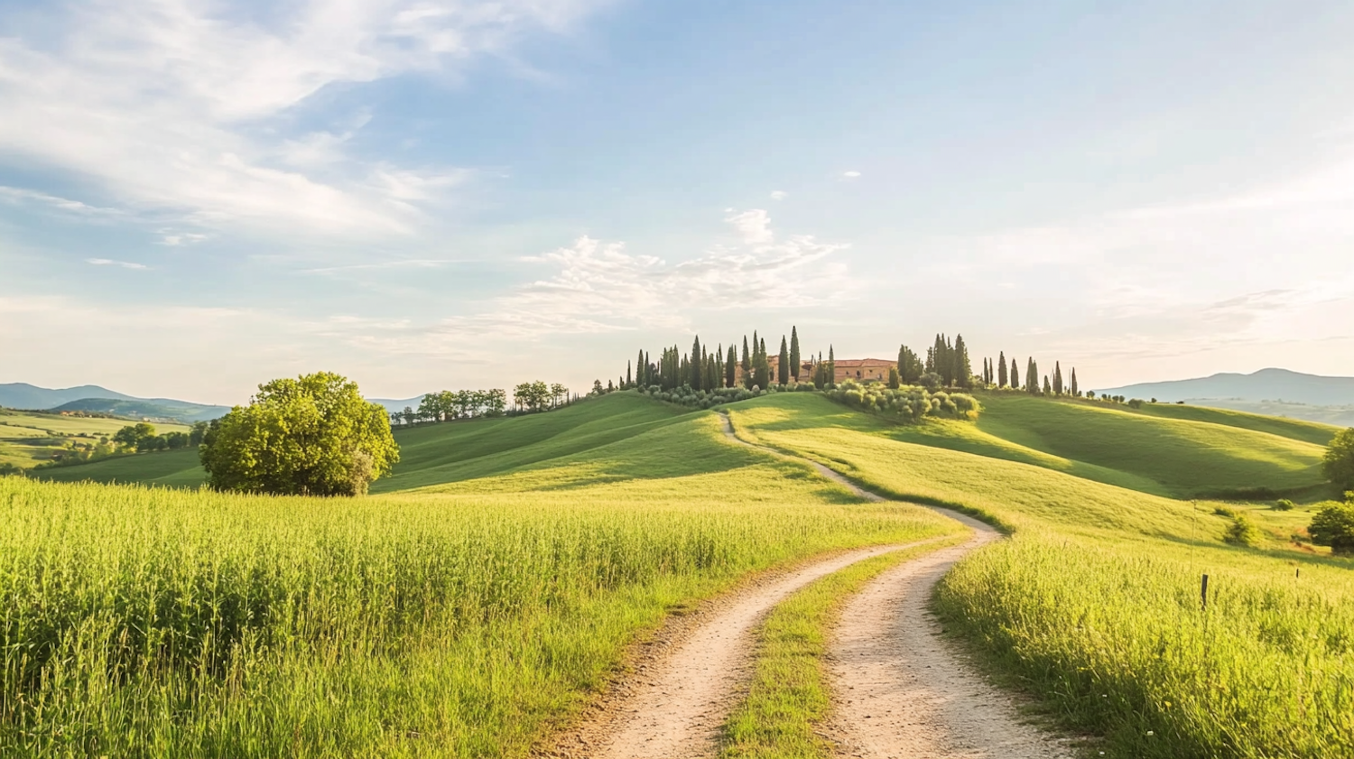 Idyllic countryside with rolling green hills, a winding dirt path, and a farmhouse surrounded by cypress trees under a golden sky.