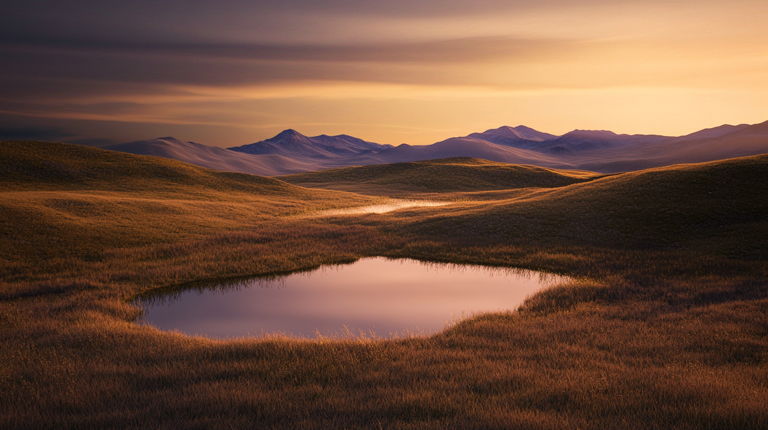 Serene landscape with golden hills, a tranquil pond, and distant mountains under a warm sunset sky.