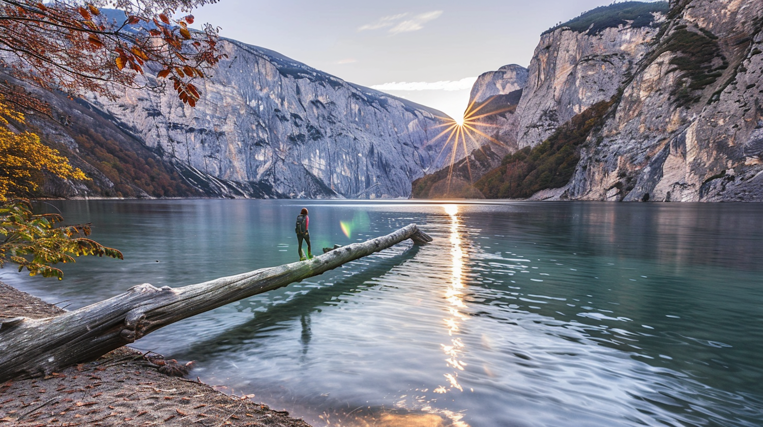 Hiker on a fallen tree over a tranquil lake at sunset, surrounded by cliffs and autumn foliage. Stunning starburst sun reflection.