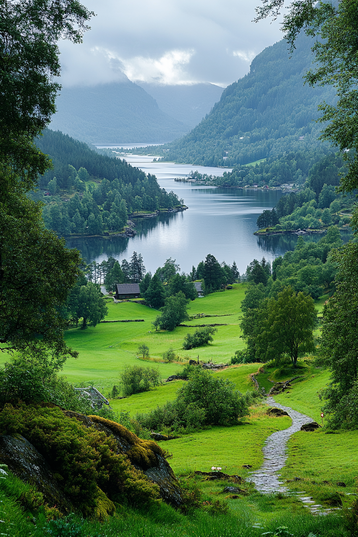 Lush green valley with a winding path leading to a tranquil lake, surrounded by misty forested hills under an overcast sky.