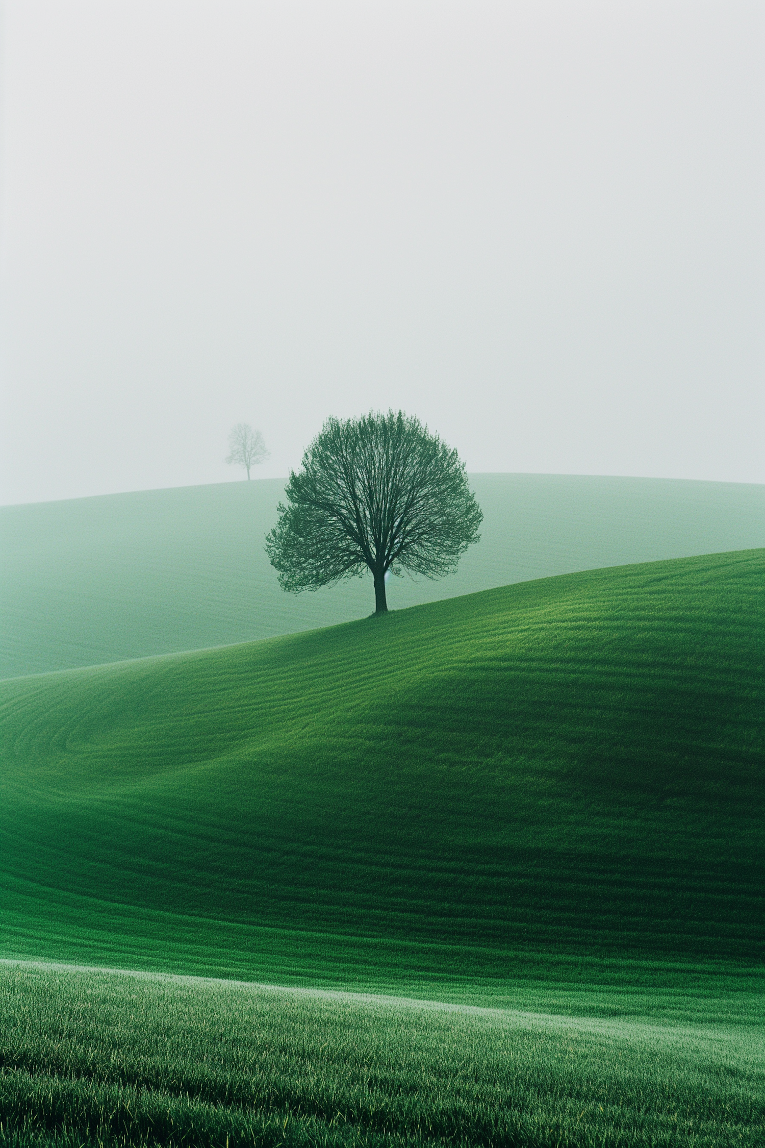Serene landscape with rolling green hills and a solitary tree under a soft, overcast sky, evoking tranquility and natural beauty.