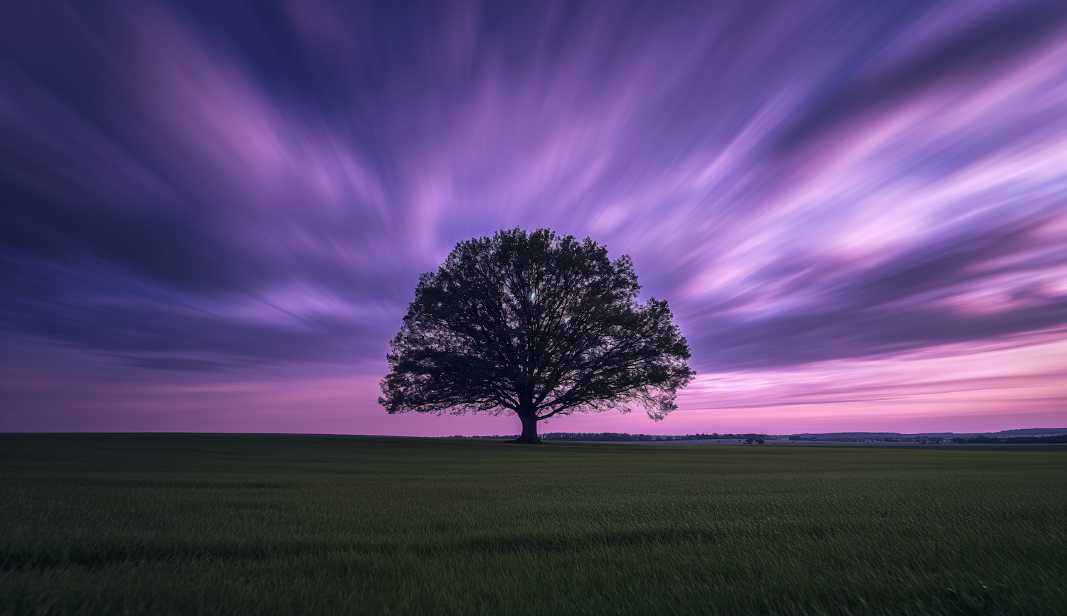 Majestic tree silhouette against a vibrant purple and pink sky, with lush green grass below, creating a tranquil and dynamic scene.