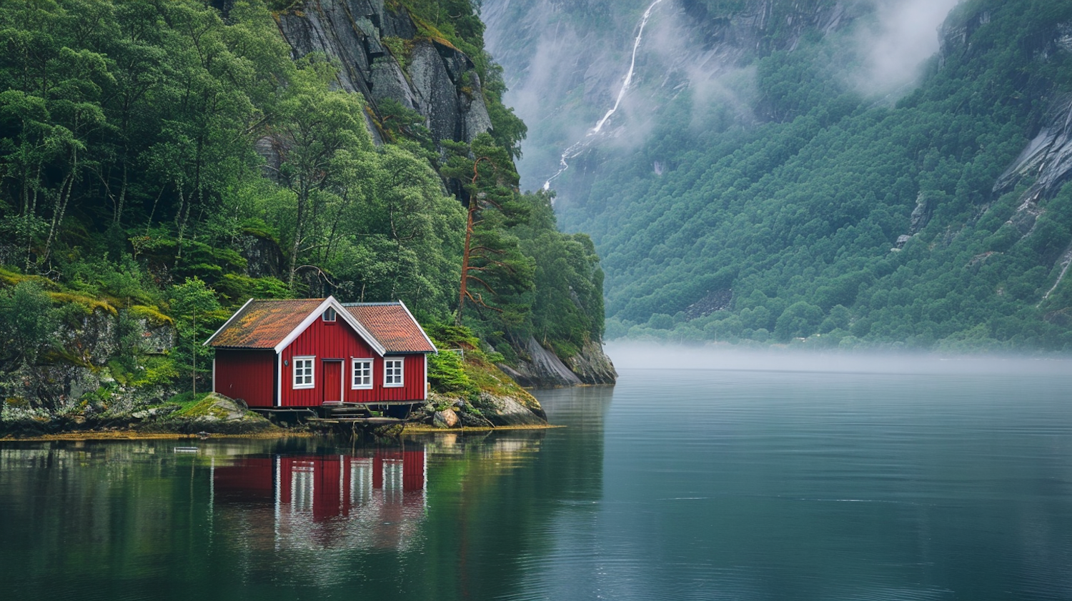 Charming red cabin by a serene lake, surrounded by lush greenery and misty mountains, creating a tranquil and picturesque scene.