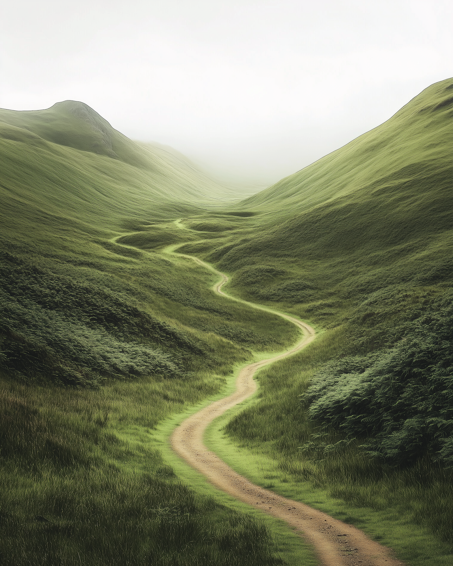 A winding path through lush green hills under a misty sky, creating a serene and tranquil landscape.
