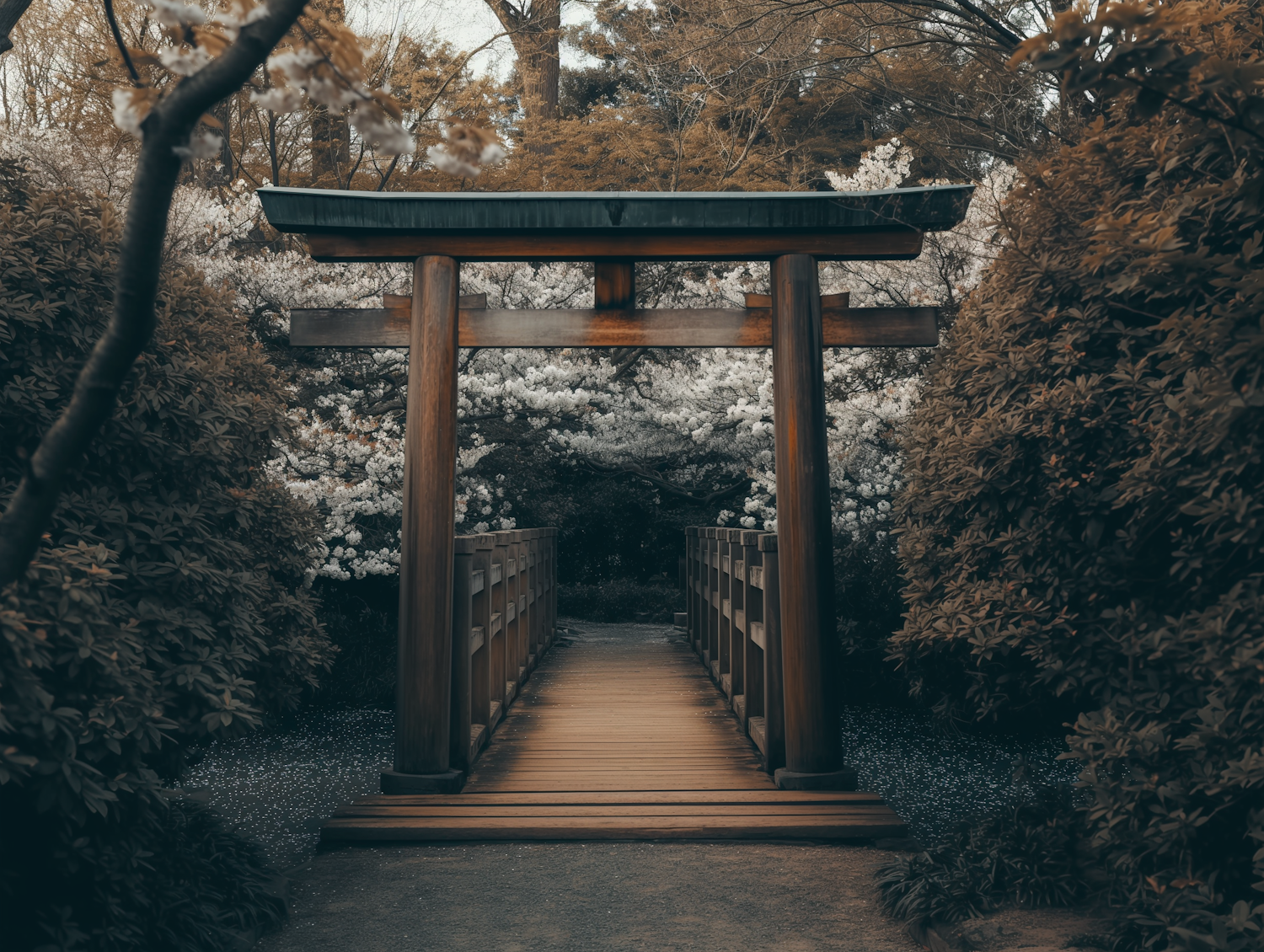 Tranquil Japanese torii gate and bridge surrounded by lush greenery and blooming flowers, creating a serene and inviting atmosphere.