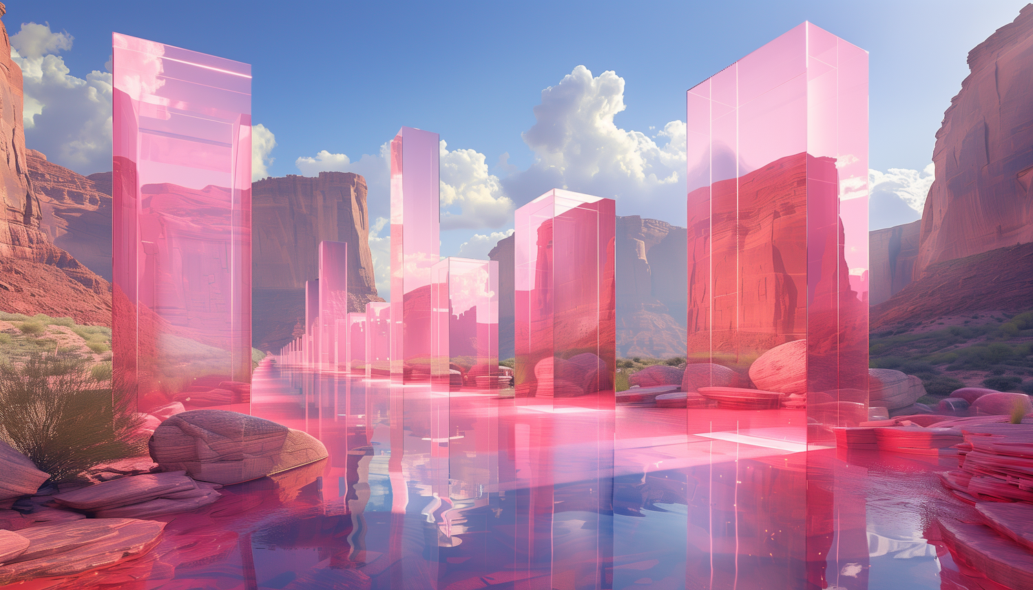 Surreal desert scene with pink translucent structures, red rock formations, reflective water, and a vibrant blue sky.