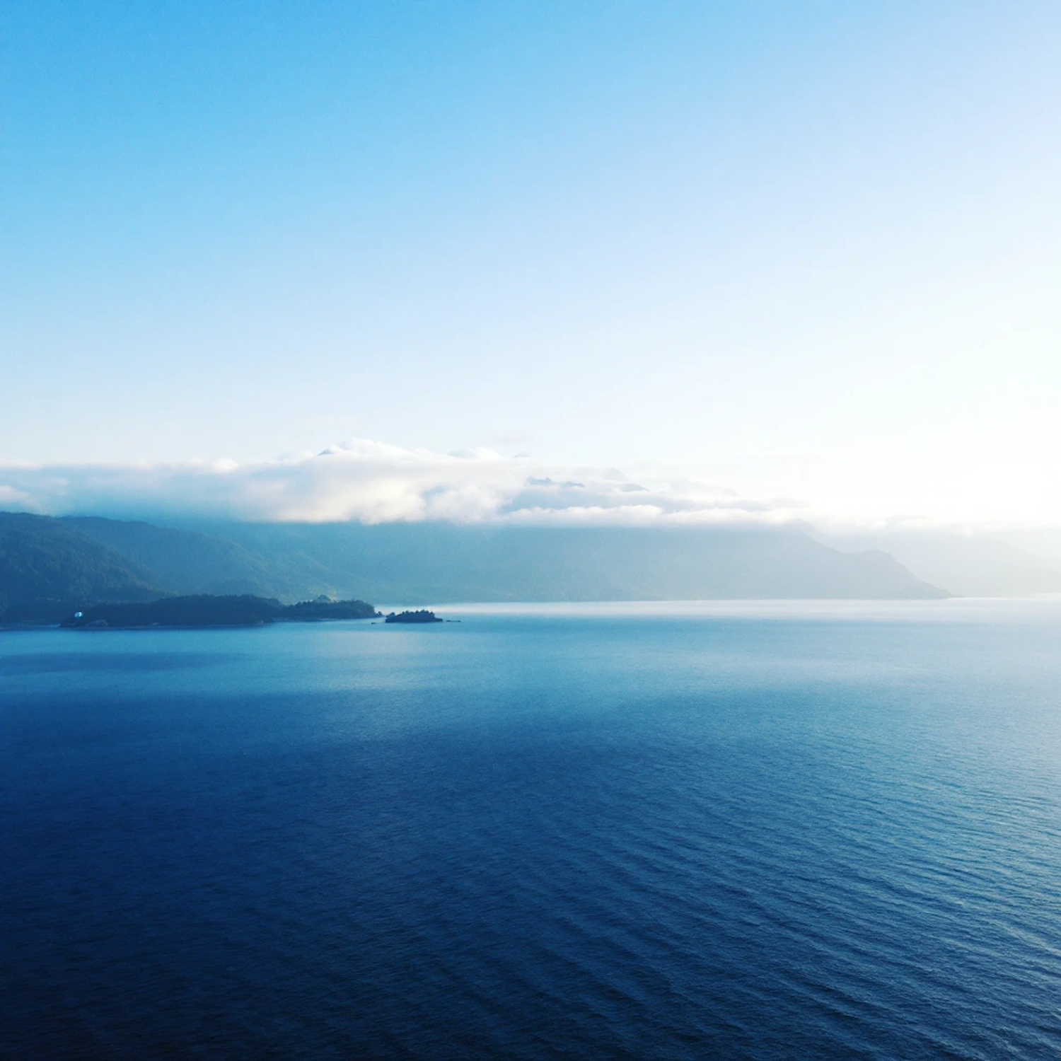 Tranquil blue waters meet distant mountains under a clear sky, creating a serene and expansive landscape.